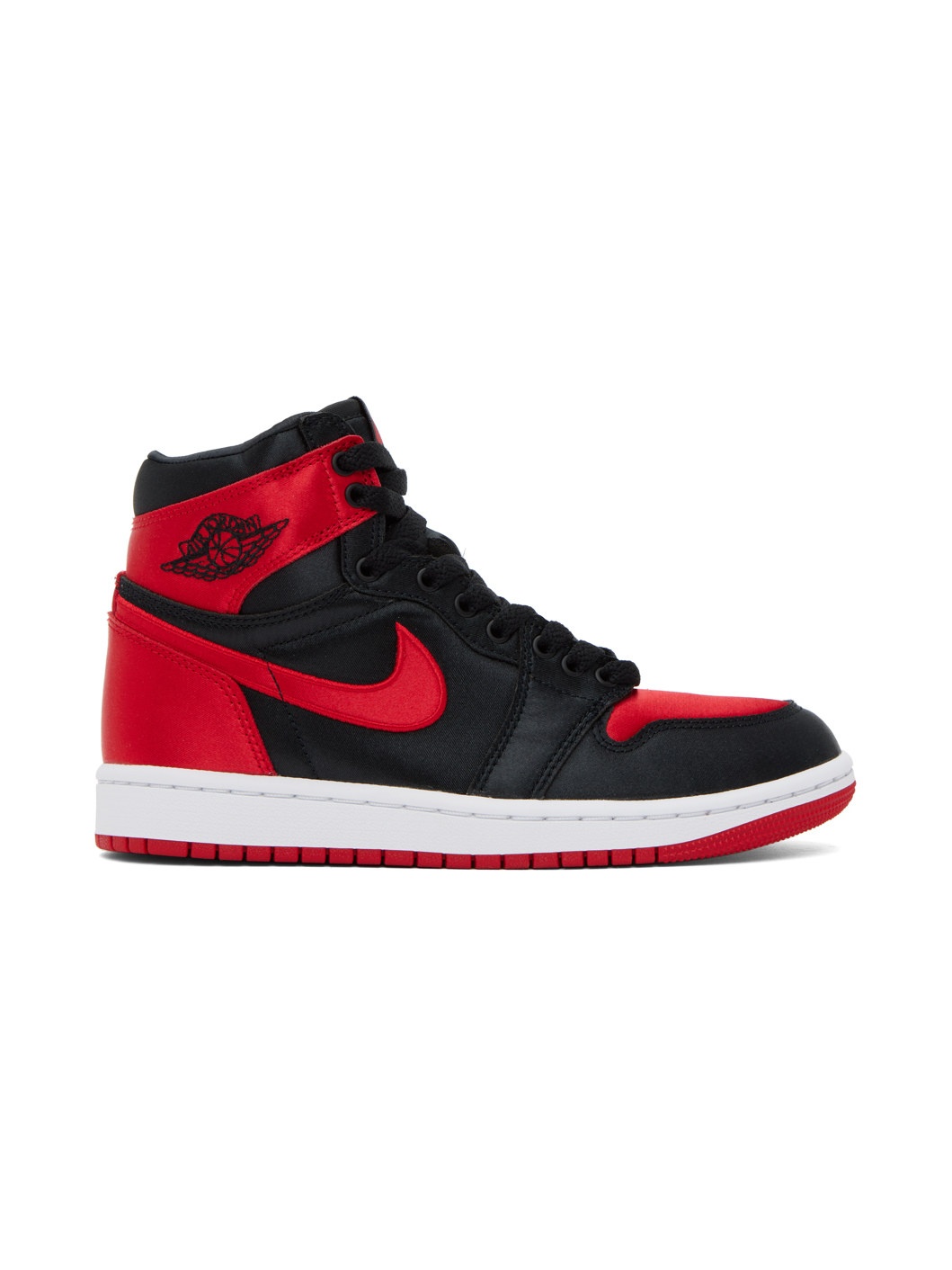 High-top paneled satin sneakers in red and black. · Perforated detailing at toe · Lace-up closure · Logo patch at padded tongue · Padded collar · Swoosh appliqué at sides · Logo embroidered at outer side · Satin and mesh lining · Treaded rubber sole Please note that this item may be shipped only within North America. Supplier color: Black/White/University red