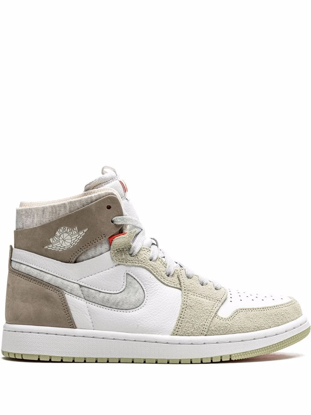 Air Jordan 1 Zoom CMFT "Olive Aura" sneakers Just like the name says, the Air Jordan 1 Zoom Air CMFT is all about comfort. Updated to make one of history's most iconic sneakers more wearable, it combines full-grain leather in the upper with a cosy lining and responsive cushioning. Highlights - White/grey - Suede/leather - Signature air jordan wings logo - Signature swoosh logo detail - Contrasting panel detail - Round toe - Front lace-up fastening - Logo patch at the tongue - Ankle-length - Branded insole - Rubber sole - These styles are supplied by a premium sneaker marketplace. stocking only the most sought-after footwear, they source and curate some of the most hard to find sneakers from around the world. Imported Composition Leather 100% SIZE & FIT FittingInformation This piece fits small – take one size up