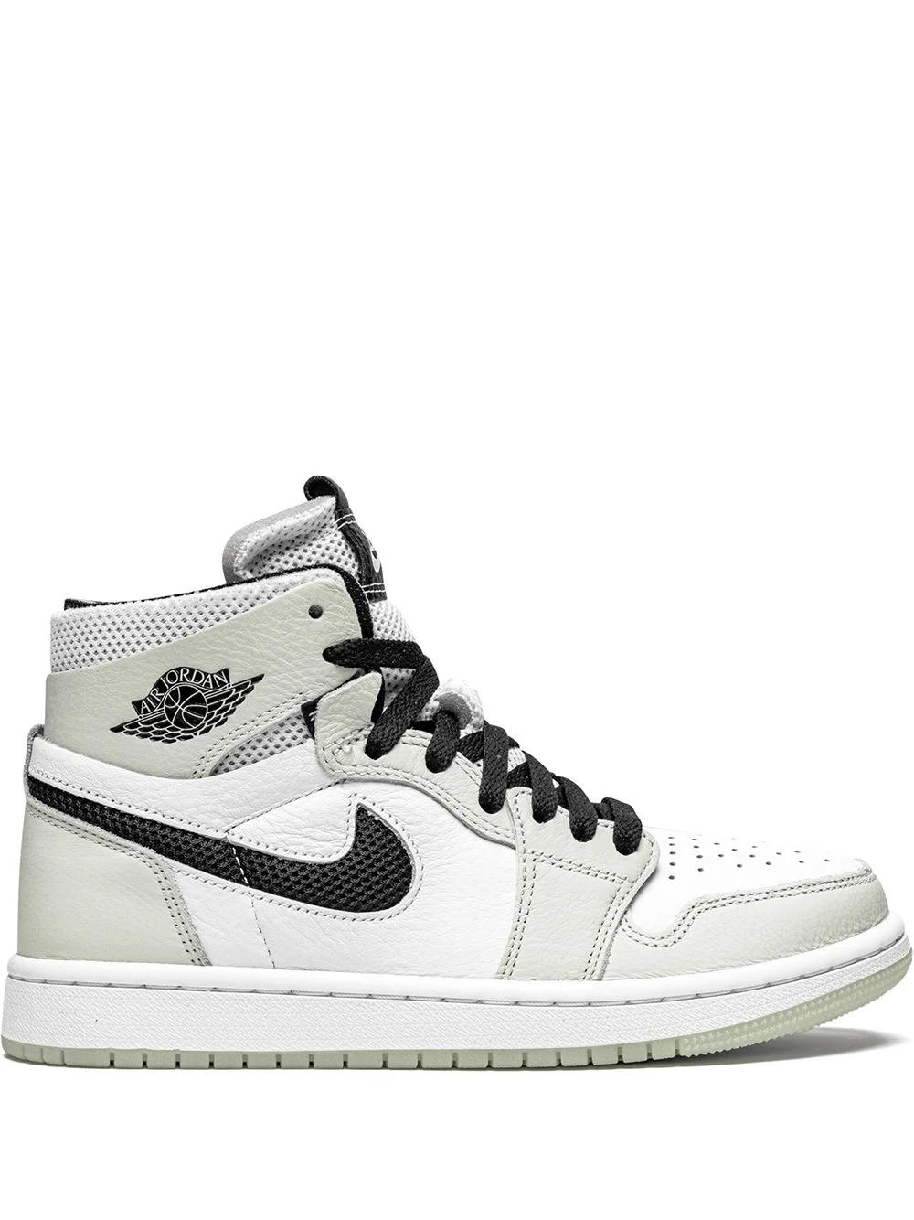 Air Jordan 1 Zoom CMFT "Light Bone" sneakers Jordan Brand launched the women’s Air Jordan 1 Zoom Comfort dressed in white and black. This version features white leather across the upper, a 'light bone' tone on the overlays, a black Swoosh on the sides and, also in black, the laces, liner, tongue label, and Wings logo. Imported Composition Leather 100% SIZE & FIT FittingInformation This piece fits small – take one size up