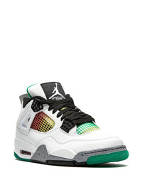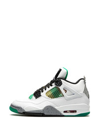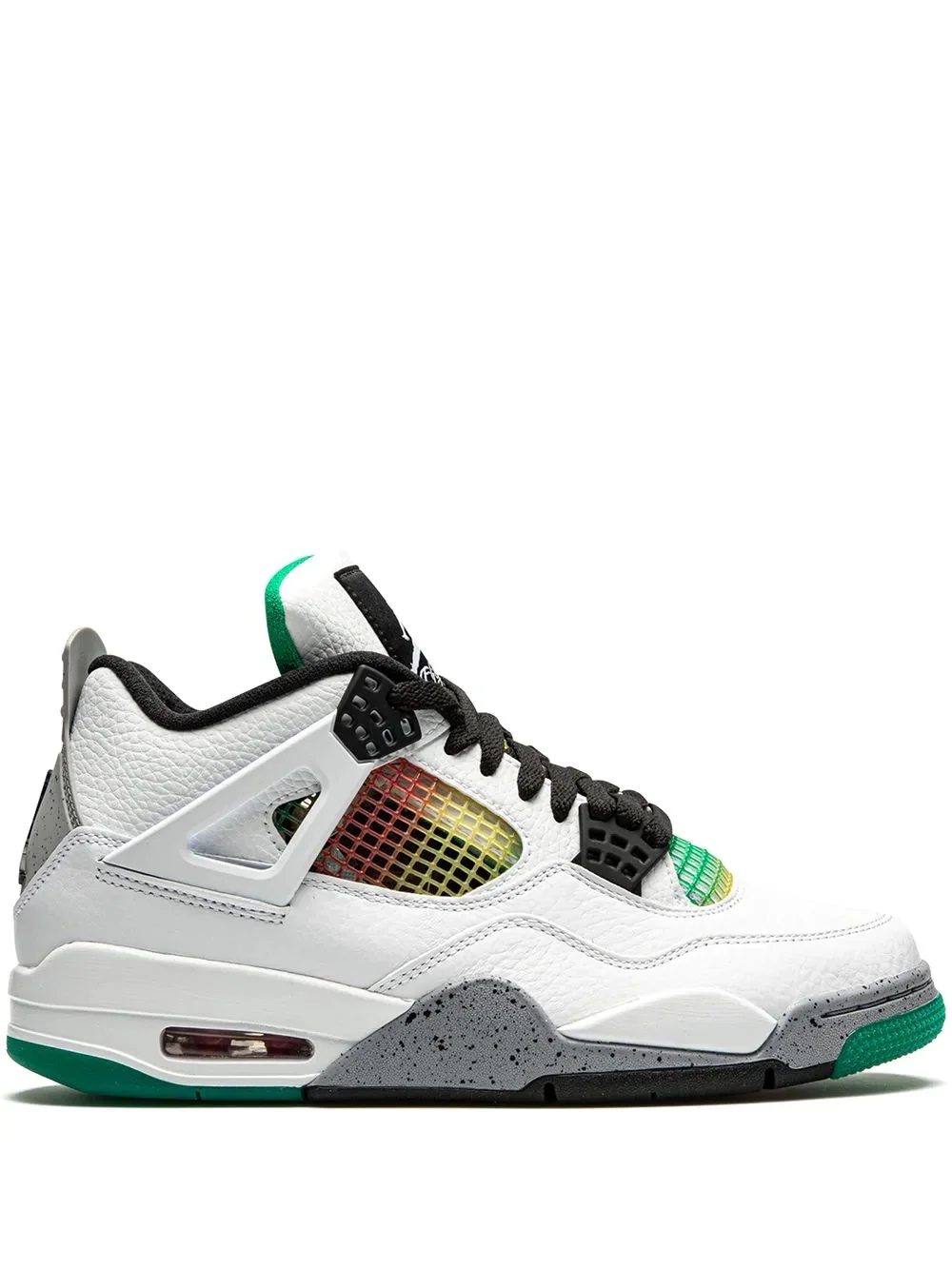Air Jordan 4 Retro "Rasta - Lucid Green" sneakers The Women’s Air Jordan 4 “Rasta” celebrates Jamaica Carnival, a festival of color, music, dance, and food, that takes place annually in Kingston, Jamaica. Appearing in women’s sizing, the Jordan 4 “Rasta” features charming overtures to reggae culture by displaying the colors of the Rastafarian movement on the netting found on the tongue and mid-panel. Black accents are found throughout, including for the Jumpman logo patch on the tongue, lace eyelets, and outsole. White leather forms the base of the shoe as it is featured on the toe, mid-panel, and heel. The shoe incorporates elements reminiscent of the “White/Cement” Jordan 4, namely the grey speckled midsole and heel tab. Release date: April 16, 2020. Imported Composition Leather 100%