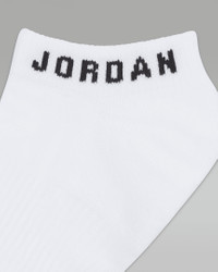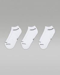 Add some comfort to your style with these no-show socks. Sweat-wicking power and breathability help keep your feet dry and cool to so you can push you through your day with full force. Benefits - Dri-FIT technology helps your feet stay dry and comfortable. - Cushioning under the forefoot and heel helps soften the impact of your workout. - Band around the arch feels snug and supportive. - Breathable knit pattern on top adds ventilation. - Reinforced heel and toe are made to last. Product Details - 97% polyester/2% spandex/1% nylon - Jordan logo - Machine Wash - Imported - Shown: White/Black - Style: DX9656-100