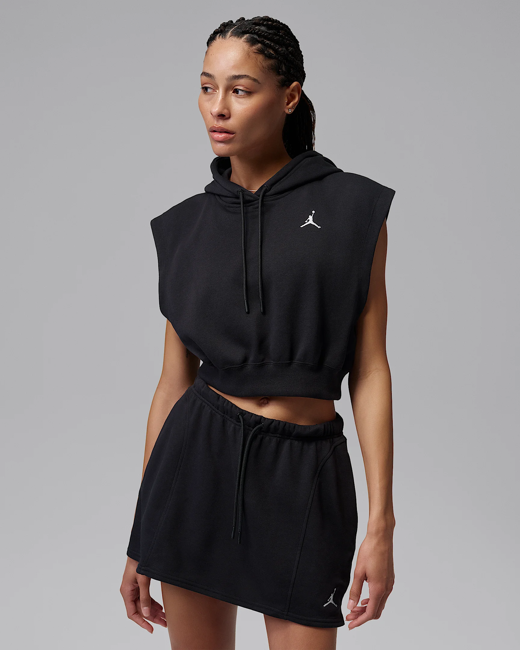 You know that MJ cutoff hoodie look—we started there and designed this top with modern style in mind. It's got a loose fit through the chest, a cinched hem for a bubble shape and lands at that mod crop length. Product Details - Body: 80% Cotton, 20% Polyester; Hood Lining: 80% Cotton, 20% Polyester; Rib: 97% Cotton, 3% Spandex - Machine wash - Imported - Shown: Black/White - Style: IF1189-010 SIZE & FIT Loose fit: roomy and relaxed