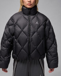This quilted puffer takes notes from our classic Diamond shorts with its diamond-shaped design. We infused it with our Therma-FIT technology to help you stay warm and cozy in harsh, cold conditions. Benefits - Nike Therma-FIT technology helps manage your body’s natural heat to help keep you warm in cold-weather conditions. - Water-repellent finish helps keep you dry in wet weather. - Synthetic fill helps keep you insulated and warm. - Two-way zipper gives you styling options. Product Details - Body/Lining/Fill: 100% polyester - Hand pockets - Elastic hem - Machine wash - Imported - Shown: Black/White - Style: HV0417-010 SIZE & FIT Model is wearing size S and is 5′8″173cm Loose fit: roomy and relaxed