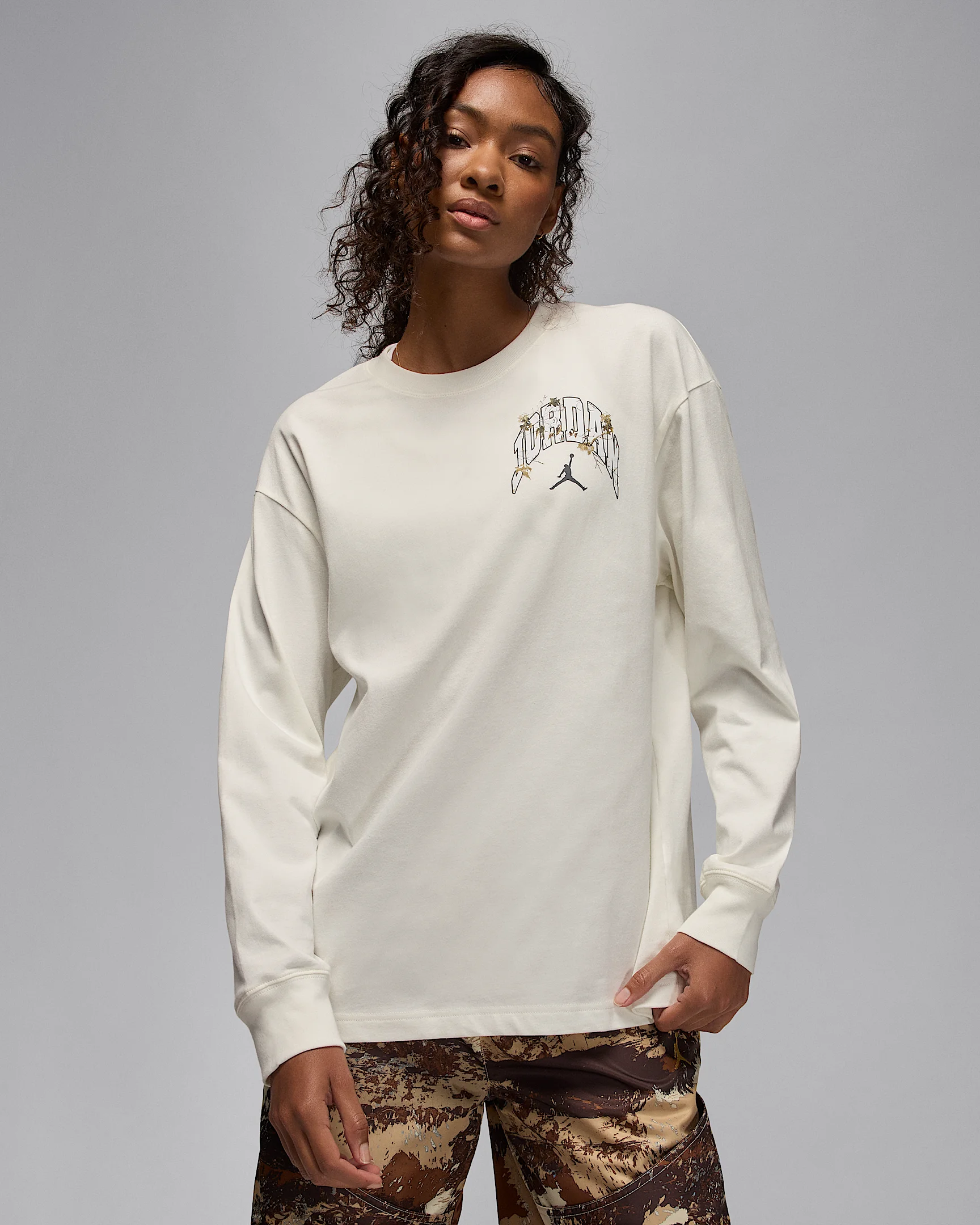 Jordan meets Realtree in this long-sleeve shirt. The oversized fit adds an extra dose of comfort. Product Details - 100% Cotton - Machine wash - Imported - Shown: Sail/Black - Style: HV0448-133 SIZE & FIT Model is wearing size S and is 5′11″180cm Oversized fit: exaggerated and spacious