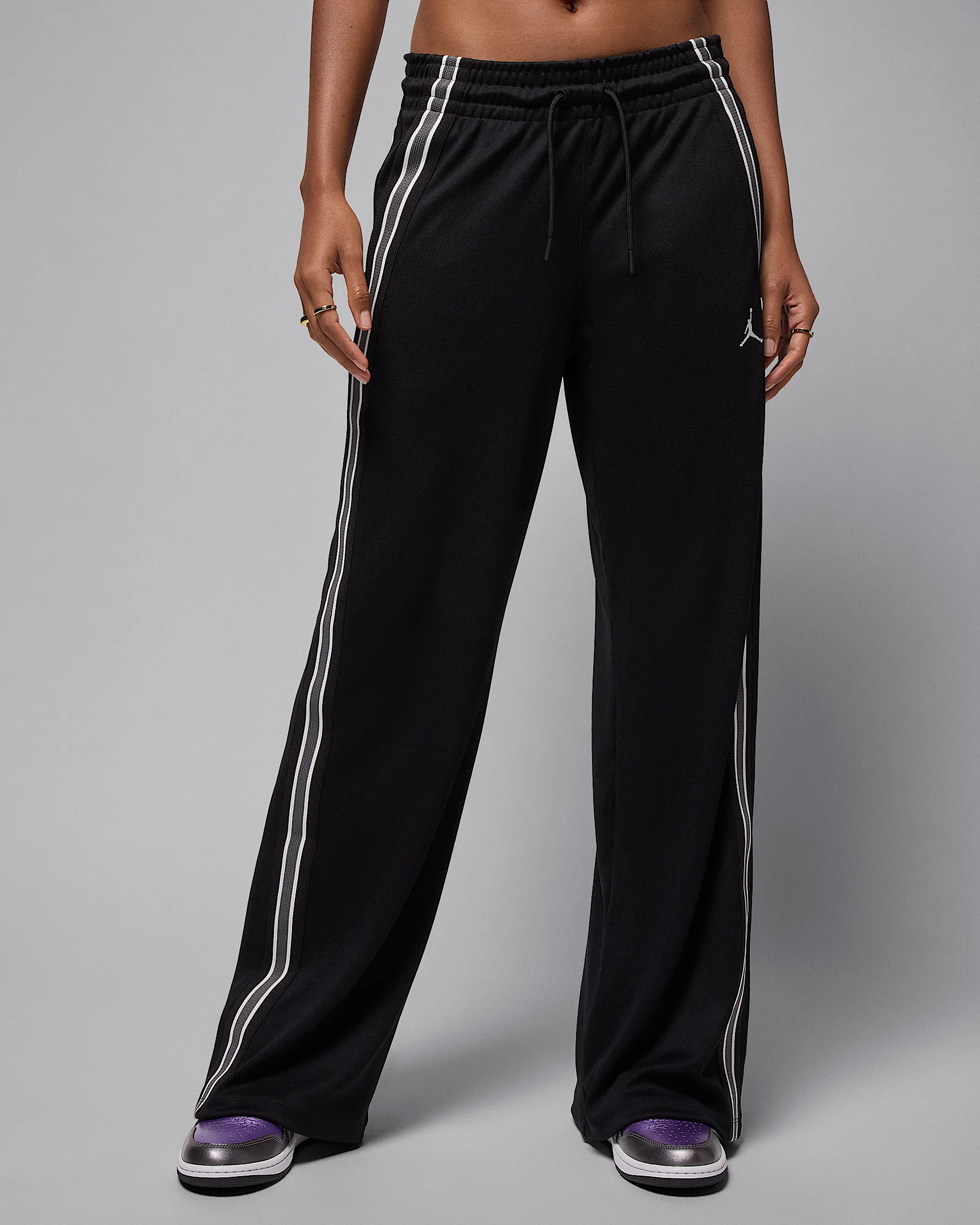 Jordan's take on track pants brings subtle flair to a comfortable, athletic classic. Made from smooth knit fabric, they have open hems and curved striped taping to add a little attitude to your look. Benefits - Elastic waistband with drawcord lets you dial in your perfect fit. - Knit fabric is soft and smooth. - Curved taping at the sides adds an athletic look. Product Details - Body: 98% polyester/2% spandex. Side pockets and back pocket knuckle side: 100% cotton. - Side and rear pockets - Machine wash - Imported - Shown: Black/Sail - Style: HQ9218-010 SIZE & FIT Model is wearing size S and is 5′11″180cm Standard fit: easy and traditional Fl length: hits below ankle