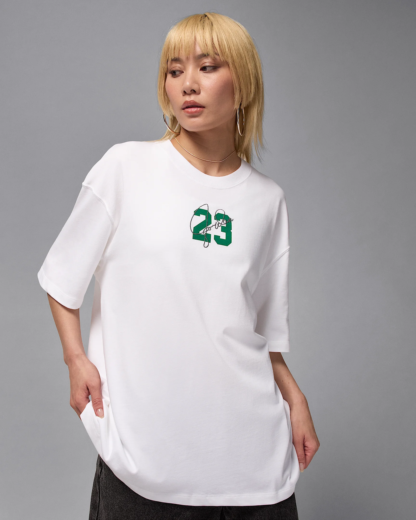 Get this one into your rotation. The Jordan Essentials Graphic T-Shirt is roomy and loose, made from premium structured cotton. Fresh "23" graphics nod to MJ, the greatest of all time. Benefits - Heavyweight cotton fabric feels structured and premium. - The fit has a roomy feel with longer, dropped-shoulder sleeves. Product Details - Loose fit for a roomy feel - Ribbed neckband - Printed graphics - 100% cotton - Machine wash - Imported - Shown: White - Style: DM3244-100 SIZE & FIT Model is wearing size S and is 5′8″173cm Loose fit: roomy and relaxed