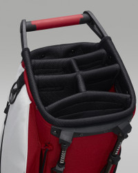 A reflection of Jordan's passion for golf, this bag combines innovation and minute details for the player who wants to take their game to the next level. Golf's well-loved traditions meet a bold, fresh design in the Jordan Golf Bag. A complete bag from top to bottom, it includes a 6-way, full-length divider system and detachable, ergonomic carrying straps. Benefits - 6-way, full-length divider system keeps your clubs organized. - Detachable, ergonomic strap can be worn over 1 or both shoulders. - Soft, velour-lined pocket helps to protect your tech and valuables. - Matching rain hood helps keep your gear dry. - Air Jordan 14-inspired towel ring allows you to access your golf towel easily. - Air Jordan 6-inspired lace-lock umbrella cinch allows you to play in inclement weather. Product Details - 34"H x 13"W - Body: 95% polyester/5% PU leather. Lining: 100% polyester. - Imported - Shown: Varsity Red/White/Black - Style: J1008184-632