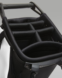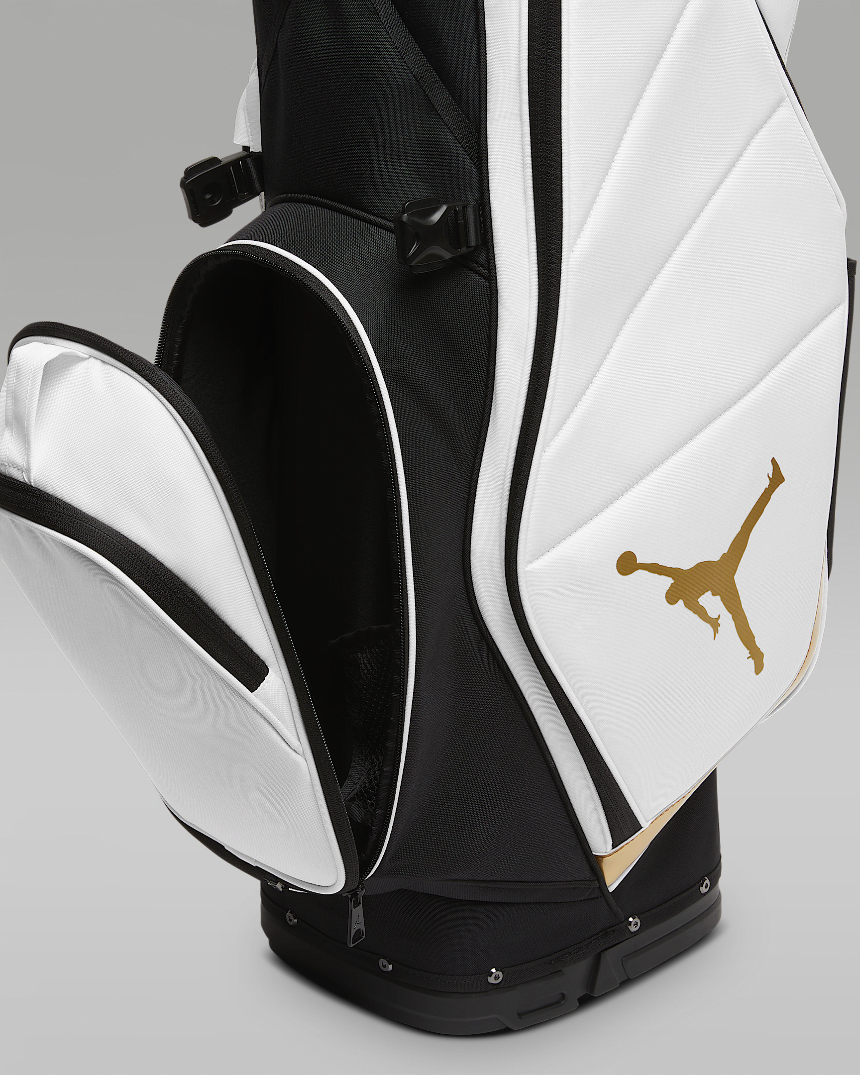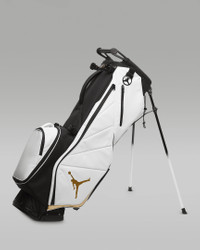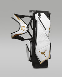 A reflection of Jordan's passion for golf, this bag combines innovation and minute details for the player who wants to take their game to the next level. Golf's well-loved traditions meet a bold, fresh design in the Jordan Golf Bag. A complete bag from top to bottom, it includes a 6-way, full-length divider system and detachable, ergonomic carrying straps. Benefits - 6-way, full-length divider system keeps your clubs organized. - Detachable, ergonomic strap can be worn over 1 or both shoulders. - Soft, velour-lined pocket helps to protect your tech and valuables. - Matching rain hood helps keep your gear dry. - Air Jordan 14-inspired towel ring allows you to access your golf towel easily. - Air Jordan 6-inspired lace-lock umbrella cinch allows you to play in inclement weather. Product Details - 34"H x 13"W - Body: 95% polyester/5% PU leather. Lining: 100% polyester. - Imported - Shown: White - Style: J1008184-109