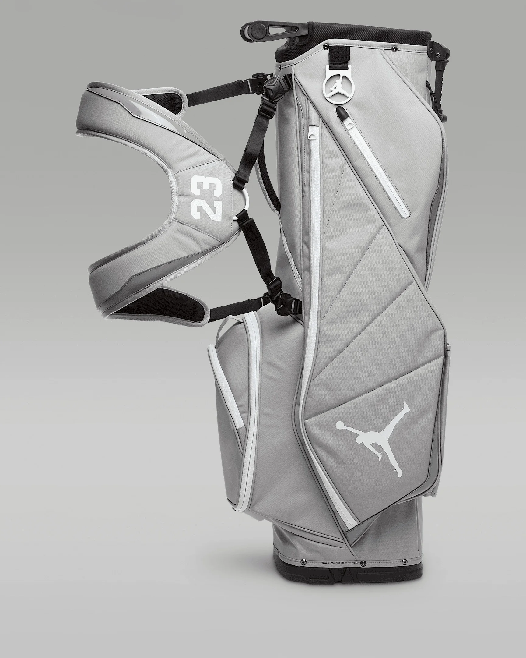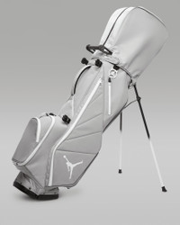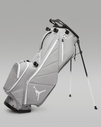 A reflection of Jordan's passion for golf, this bag combines innovation and minute details for the player who wants to take their game to the next level. Golf's well-loved traditions meet a bold, fresh design in the Jordan Golf Bag. A complete bag from top to bottom, it includes a 6-way, full-length divider system and detachable, ergonomic carrying straps. Benefits - 6-way, full-length divider system keeps your clubs organized. - Detachable, ergonomic strap can be worn over 1 or both shoulders. - Soft, velour-lined pocket helps to protect your tech and valuables. - Matching rain hood helps keep your gear dry. - Air Jordan 14-inspired towel ring allows you to access your golf towel easily. - Air Jordan 6-inspired lace-lock umbrella cinch allows you to play in inclement weather. Product Details - 34"H x 13"W - Body: 95% polyester/5% PU leather. Lining: 100% polyester. - Imported - Shown: Medium Grey - Style: J1008184-022