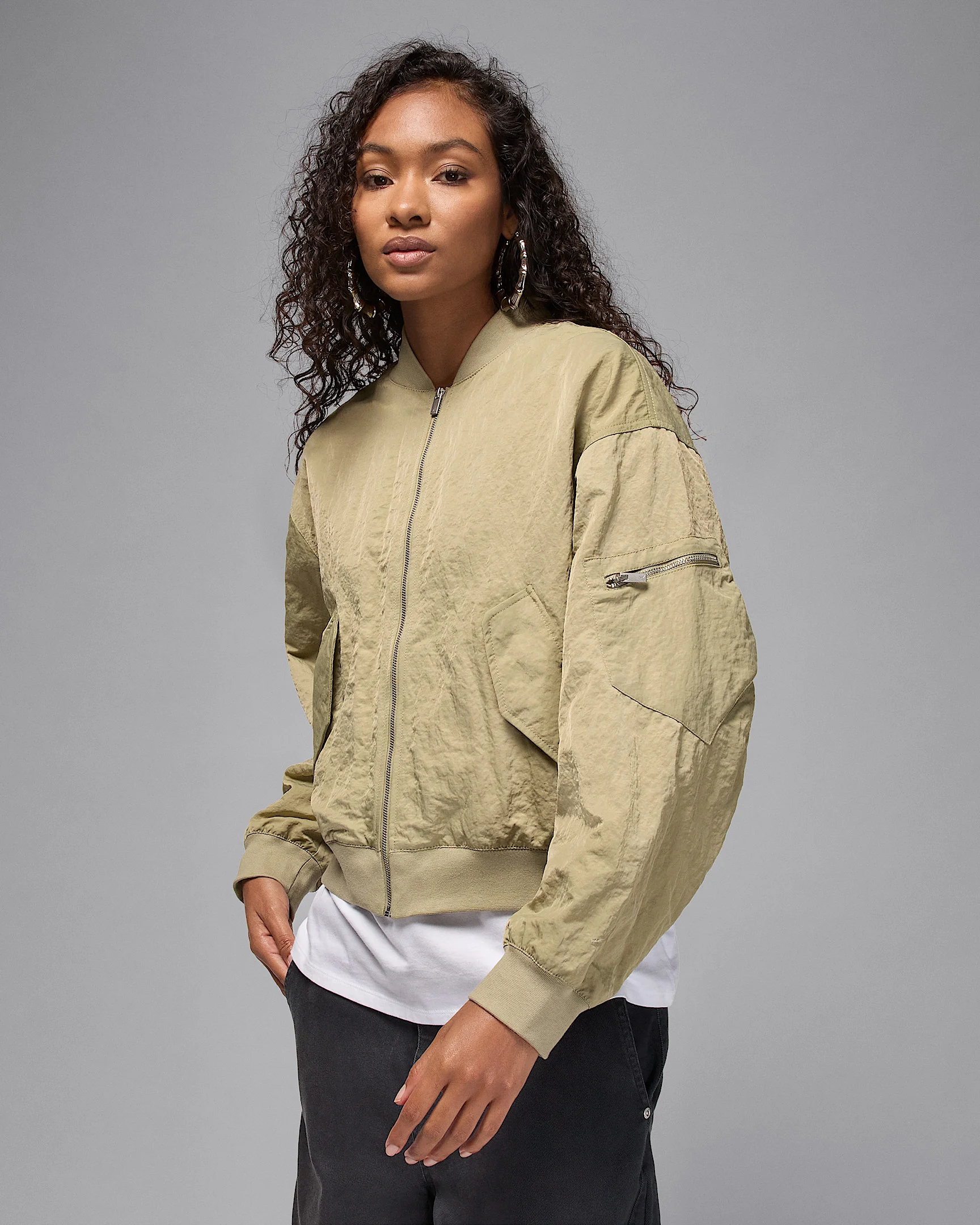 Whatever the season, our roomy Renegade jacket is a surefire silhouette. This lightweight iteration pairs a water-repellent woven shell and breathable mesh lining with classic Jordan details like diamond-shaped pockets. Product Details - Body: 100% nylon. Rib: 98% cotton/2% spandex. Lining: 100% polyester. - Ribbed cuffs, collar and hem - Front pockets - Zippered sleeve pocket - Machine wash - Imported - Shown: Medium Khaki/Team Orange - Style: HJ0544-205 SIZE & FIT Model is wearing size S and is 5′11″180cm Loose fit: roomy and relaxed