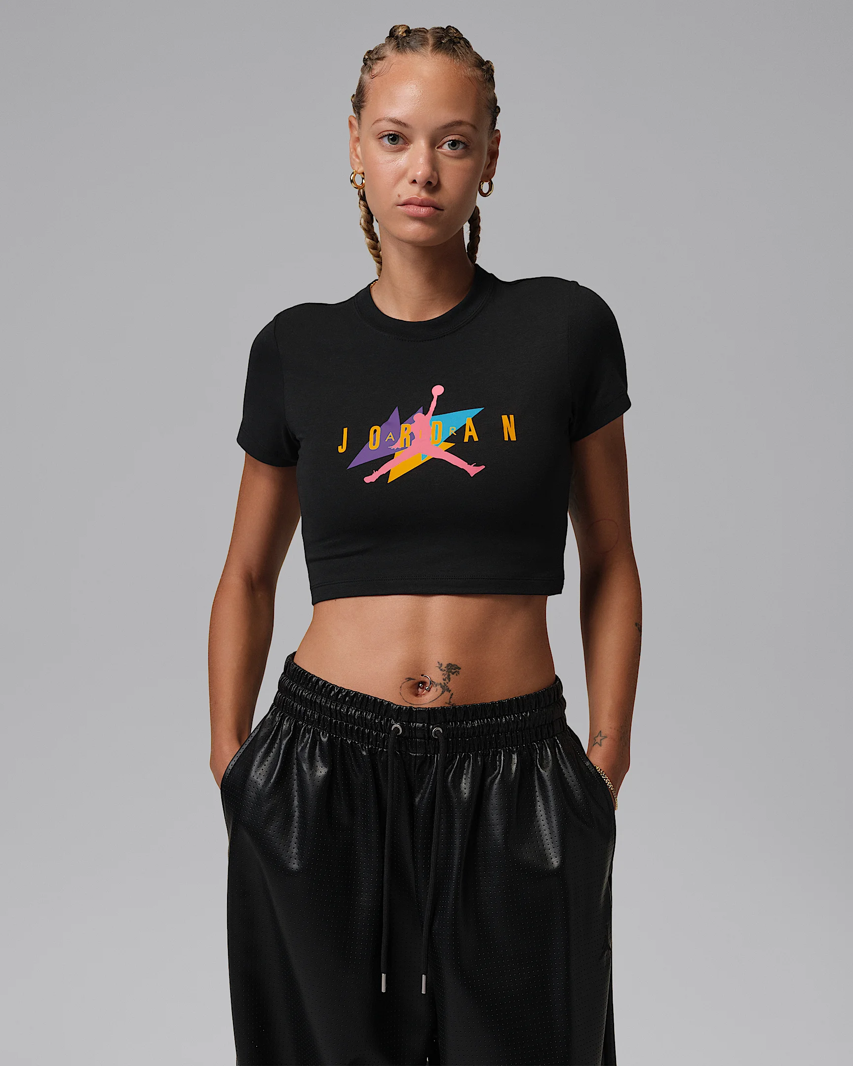 Linking the past to the present, this comfy cropped tee features classic archival Jordan graphics for unmistakable style. Product Details - 48% Modal, 46% Cotton, 6% spandex - Machine wash - Imported - Shown: Black/White - Style: IF0824-010 SIZE & FIT Model is wearing size S and is 5′8″173cm Tight fit: snug and form-fitting