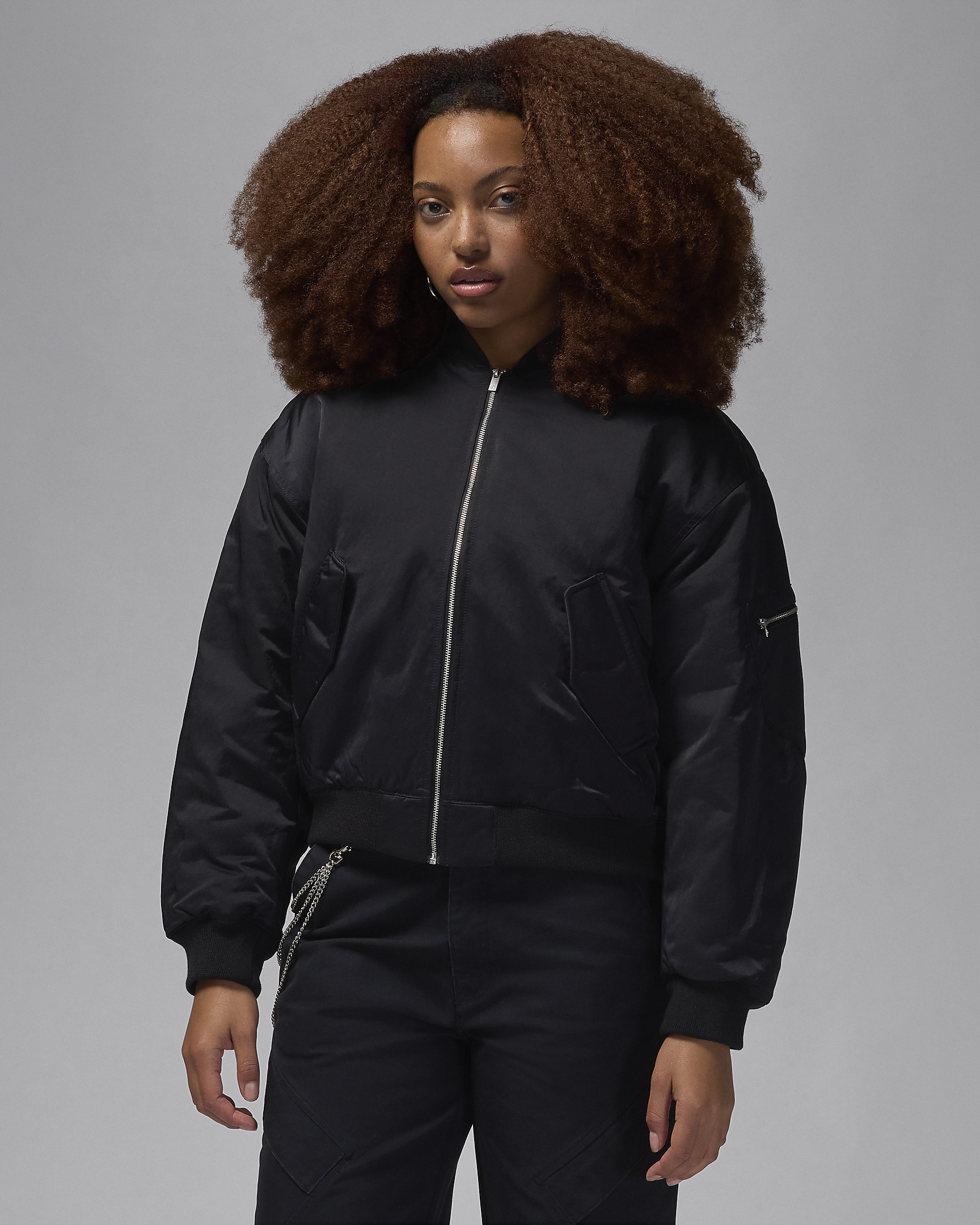 The Renegade is Jordan's take on the iconic bomber jacket. Made with a smooth, water-repellent woven fabric, this oversized jacket is filled with synthetic insulation for lightweight warmth. A diamond-shaped pocket on the sleeve adds signature Jordan style. Benefits - Water-repellent finish helps keep you dry in wet weather. - Synthetic fill helps keep you insulated and warm. - Ribbing at cuffs, hem and collar helps keep warmth in and the elements out. - Side pockets with snap-button closures help provide secure storage for your essentials. Product Details - Body/Lining: 100% nylon. Fill: 100% polyester. - Machine wash - Imported - Shown: Black - Style: FV7107-010 SIZE & FIT Model is wearing size S and is 5′10″178cm Loose fit: roomy and relaxed