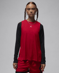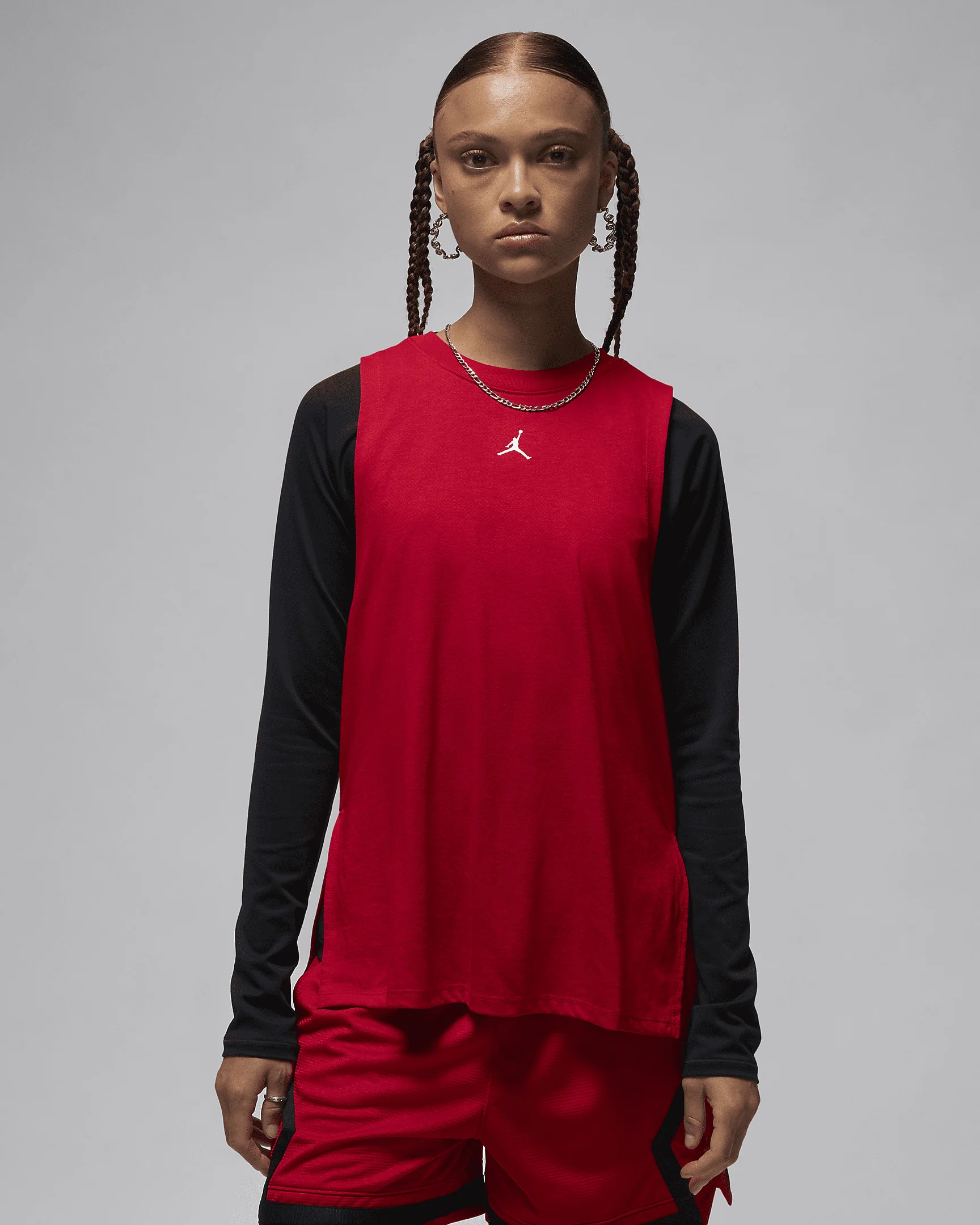 Breeze through your workouts in this lightweight mesh tank. Loose-fitting with a hem that hits below the waist, it's designed to let you move freely. And check out the panel on the back—its Diamond shape recalls one of Jordan's most iconic designs. Benefits - Nike Dri-FIT technology moves sweat away from your skin for quicker evaporation, helping you stay dry and comfortable. - Side slits for added ventilation and ease of movement. - Lightweight power mesh panel on the back increases breathability. Product Details - Center front Jumpman in rubber print - Body: 76% polyester/12% cotton/12% rayon. Inset: 81% nylon/19% spandex. - Machine Wash - Imported - Shown: Gym Red/White - Style: FB4629-687 SIZE & FIT Model is wearing size S and is 5′9″175cm Loose fit: roomy and relaxed