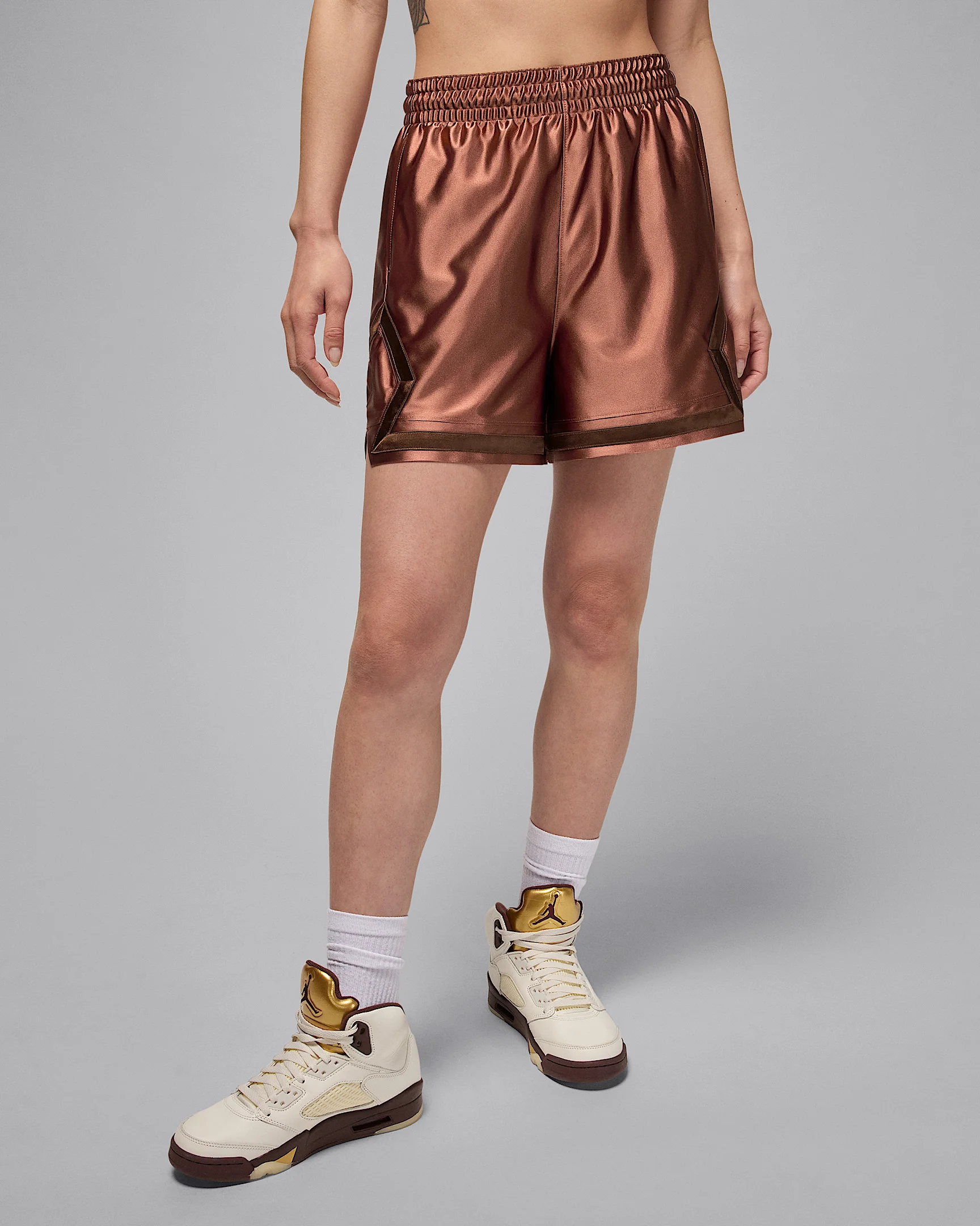 With our sweat-wicking tech and a 4" inseam, these Diamond shorts get it right. They're made with a shiny knit fabric that brings a soft sheen to your look. Our signature diamond taping keeps them rooted in heritage Jordan style. Benefits - Nike Dri-FIT technology moves sweat away from your skin for quicker evaporation, helping you stay dry and comfortable. - Lightweight knit fabric is smooth with a slight shine. - Stretchy elastic waistband helps provide a comfortable fit. Product Details - Body/Pocket bags: 100% polyester - Side pockets - 4" inseam - Machine wash - Imported - Shown: Red Bark/Cacao Wow - Style: HQ8908-219 SIZE & FIT Model is wearing size S and is 5′8″173cm Standard fit: easy and traditional