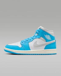 The Air Jordan 1 Mid brings full-court style and premium comfort to an iconic look. Its Air-Sole unit cushions play on the hardwood, while the padded collar gives you a supportive feel. Benefits - Premium leather and synthetic upper provides durability, comfort and support. - Air-Sole unit in the heel delivers signature cushioning. - Rubber outsole offers traction on a variety of surfaces. Product Details - Shown: Dark Powder Blue/White/Sail/Neutral Grey - Style: BQ6472-400