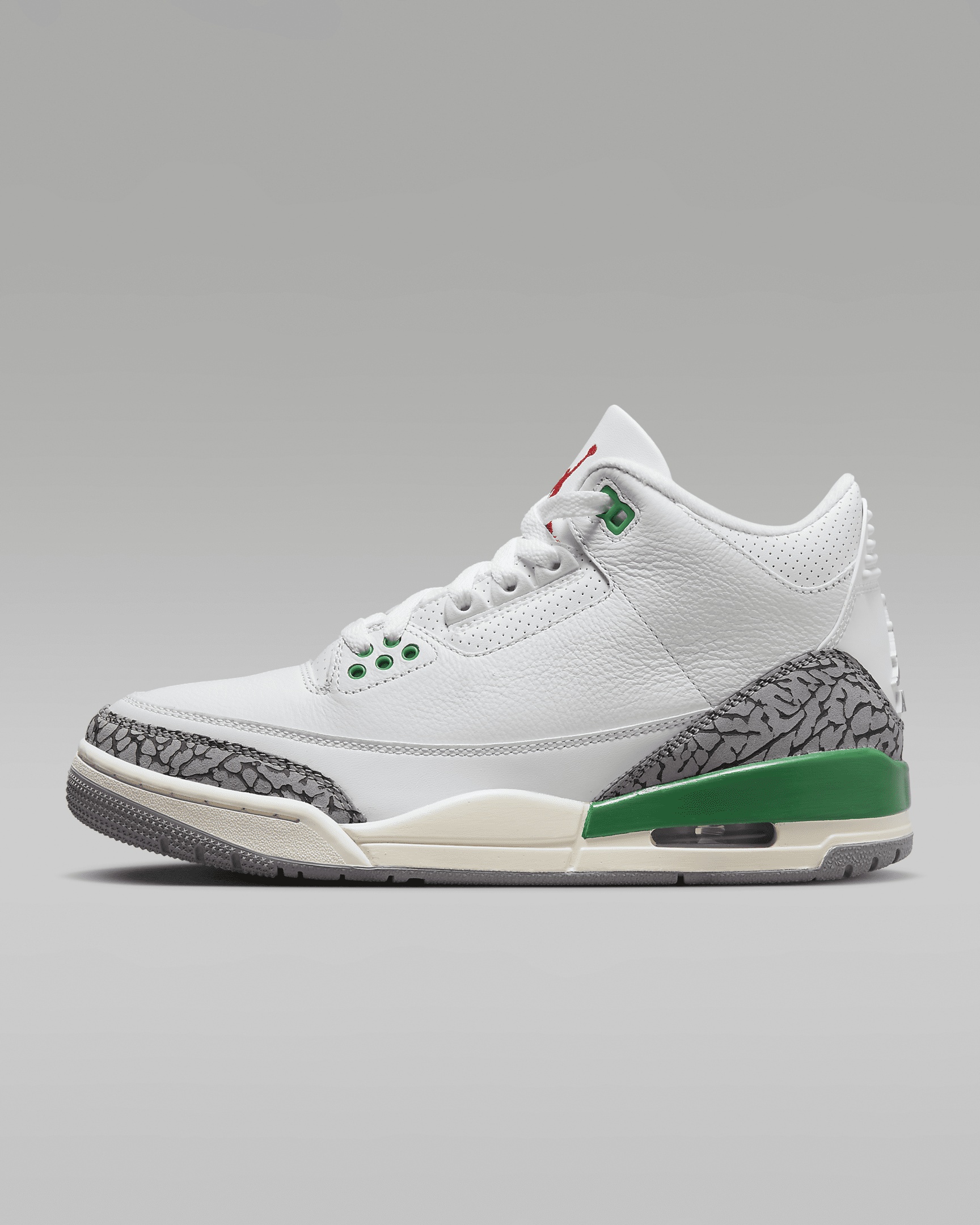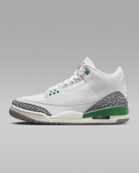 Set the gold standard with the Air Jordan 3. An all-time favorite, this fresh colorway adds to the legacy. Of course, a hangtag certifies your place on the team—and the elephant print detailing delivers a classic finish. Product Details - Leather and synthetic leather materials in upper - Foam midsole - Rubber outsole - Shown: White/Lucky Green/Cement Grey/Varsity Red - Style: CK9246-136