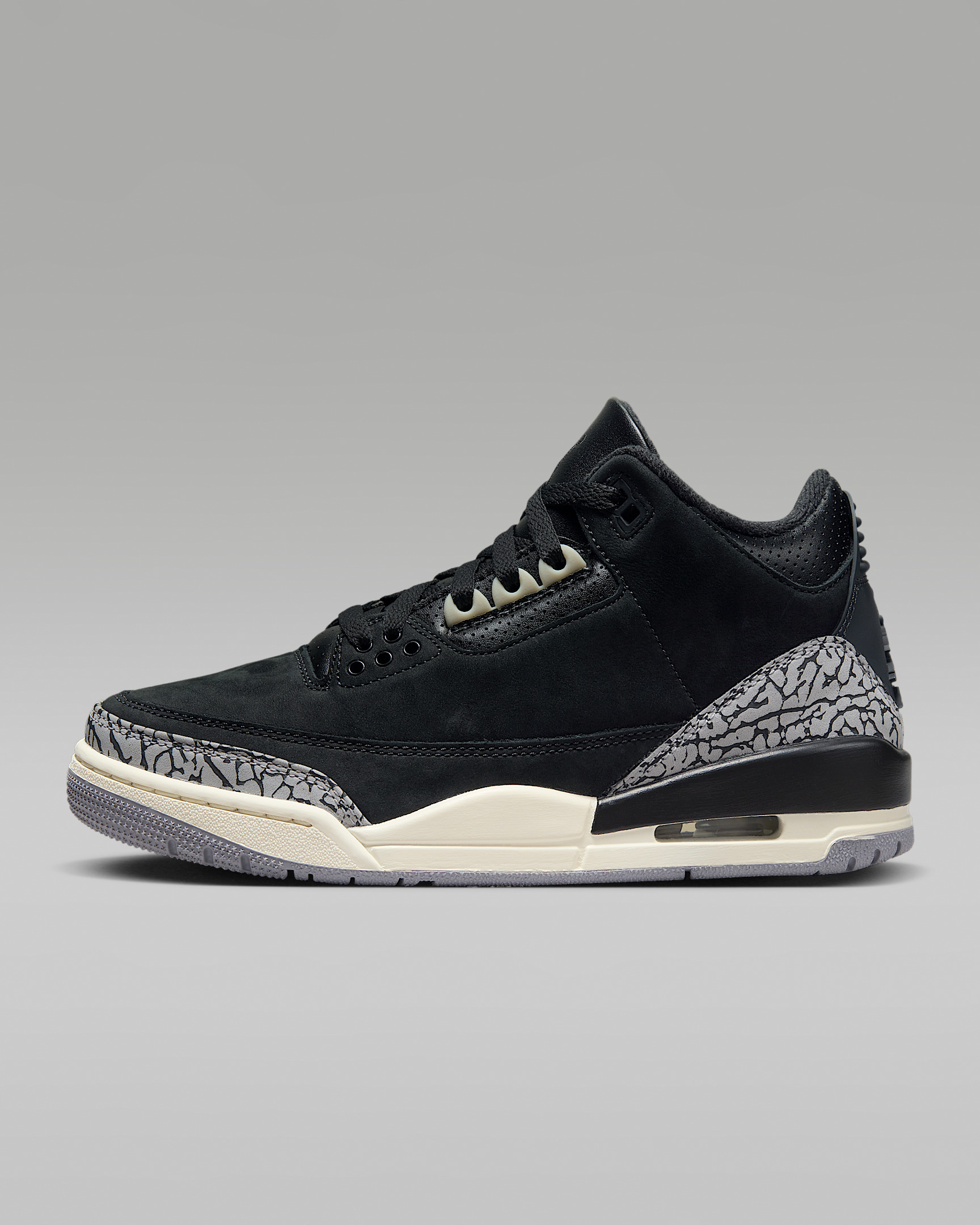 Set the gold standard with the Air Jordan 3. An all-time favorite, this fresh colorway adds to the legacy. Of course, a hangtag certifies your place on the team—and the elephant print detailing delivers a classic finish. Product Details - Leather and synthetic leather materials in upper - Foam midsole - Rubber outsole - Shown: Off Noir/Sail/Cement Grey/Black - Style: CK9246-001