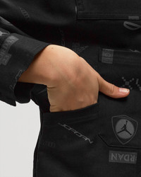 The Jordan Trucker Jacket is made of heavy cotton twill and decorated with a print throughout that pays tribute to Jordan's 23 legendary logos. The jacket features rubberized snaps and patch pockets, as well as satin-lined side pockets. Article Number: DX0384-010 Gender: Women Color: BLACK Material: 98% Cotton, 2% Spandex/elastane