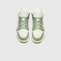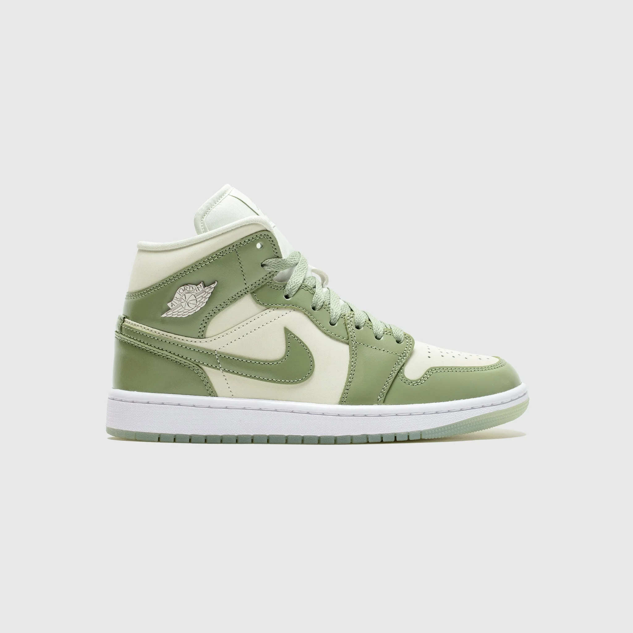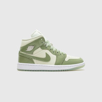 - HF4079 003 - Sea Glass/Oil Green-Metallic Silver - A WMNS mid-cut iteration of the iconic Air Jordan 1 - Sea glass leather upper - Oil-green leather overlays - Oil green leather swoosh - Sea glass nylon mesh tongue with "AIR JORDAN" tongue tag - Metallic silver Jordan's "WINGS" logo on the side - Summit white rubber midsole - Sea glass translucent rubber outsole