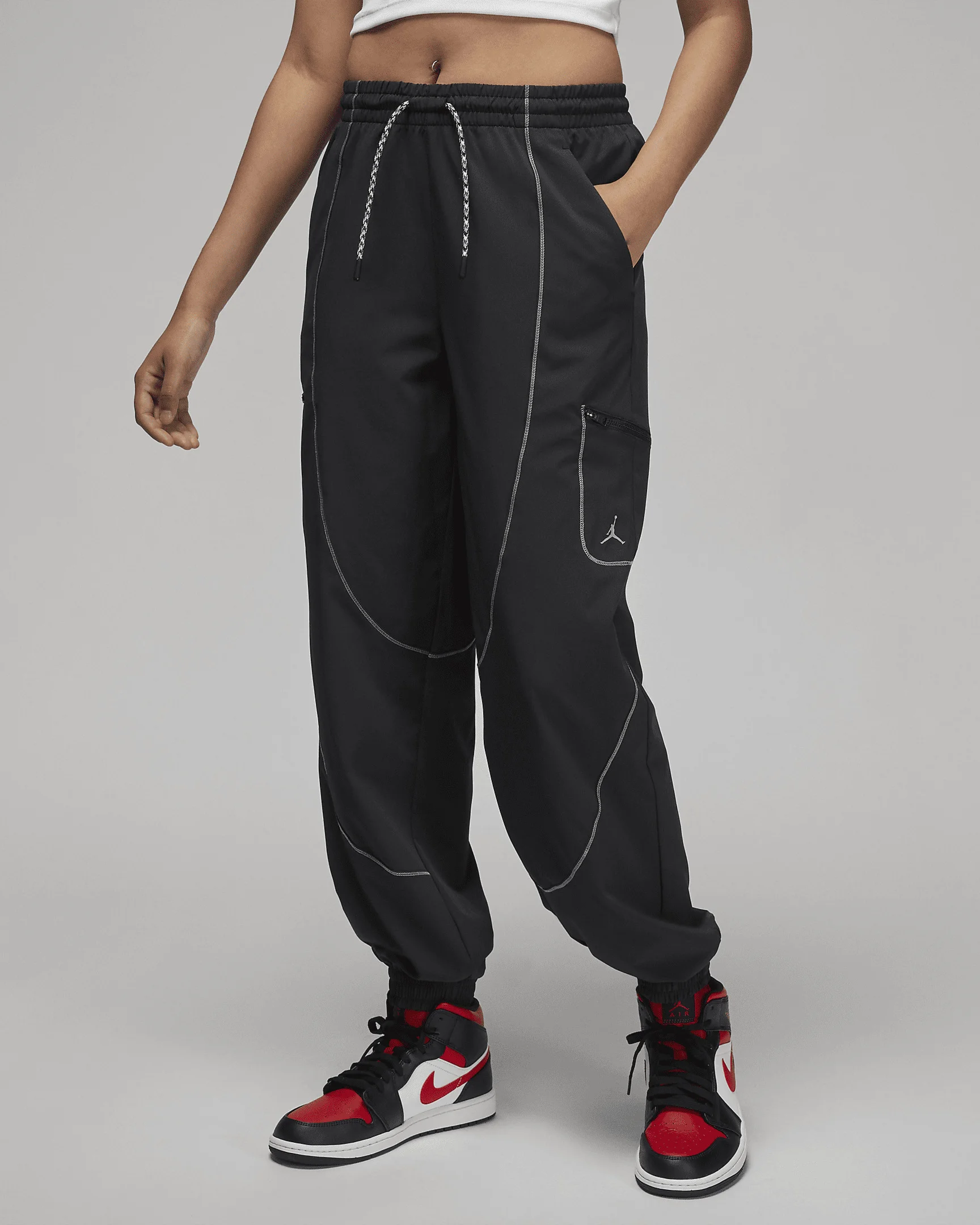 Players have the tunnel walk. You have the sidewalk. Both are the perfect opportunity to get a 'fit off. The easy, relaxed cut and 4-way stretch material lets these pants move with you while maintaining their shape (and your look). Gathered jogger-style cuffs break perfectly to showcase that pair of J's you just added to your rotation. Benefits - Wings lines harken back to classic Jordan Brand DNA. - Rubber print Jumpman on the left thigh gives your outfit a stamp of approval. Product Details - 85% polyester/15% spandex - Machine Wash - Imported - Shown: Black/Stealth/Stealth - Style: FB4659-010 SIZE & FIT Model is wearing size S and is 5′9″174cm Loose fit: roomy and relaxed Fl length: hits below ankle
