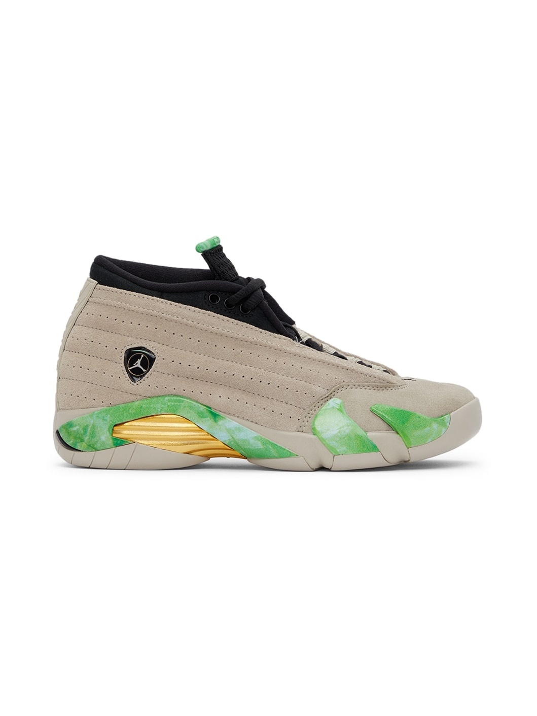 Low-top paneled buffed suede leather sneakers in taupe and black. Embroidered logo in black at round toe. Lace-up closure in black. Rubberized tab in tones of green featuring embossed logo at padded tongue. Padded collar. Tonal rubberized tab featuring embossed logo in beige at heel. Perforated detailing at sides. Logo plaque in black, white, and gold-tone at outer side. Sculpted rubber midsole in gold-tone and tones of green. Tonal treaded rubber sole. Part of the Nike Jordan x Aleali May capsule collection. Supplier color: Light sand Upper: leather, rubber, textile. Sole: rubber.