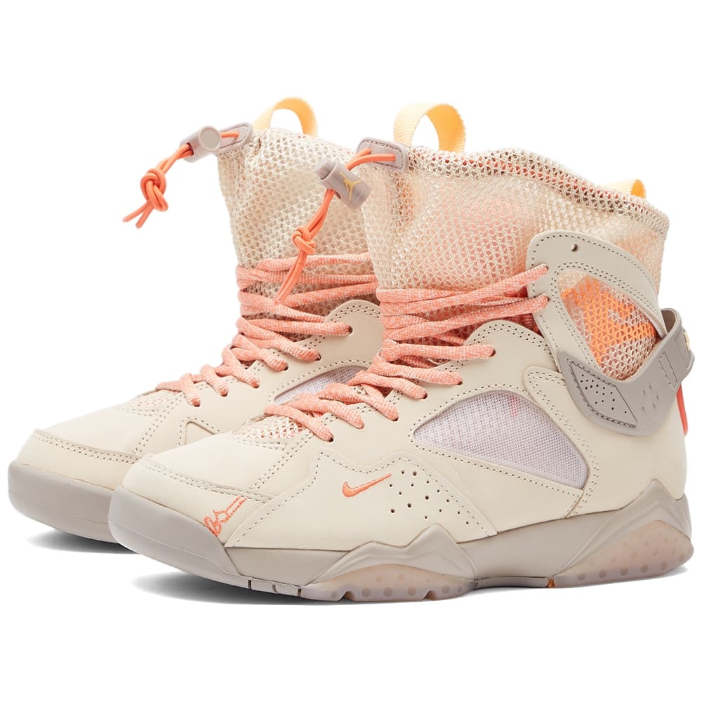 Air Jordan joins forces with Bephie’s Beauty Supply of Los Angeles this season to reimagine the world-renowned AJ7 model once more – this time in a peachy colourway. The huarache-inspired design is a neoprene bootie fitted with a comfy mesh shroud which extends up to the ankle. The Jumpman logo is projected onto the inner mesh, while a forefoot Swoosh appears just under the quarter mudguard. The most significant touch, though, is the added toecap, which has extended embroidery that falls from the lace collar to the toe box. - Mesh Uppers - Leather Overlays - Rubber Outsole - Style Code: DR1485-168