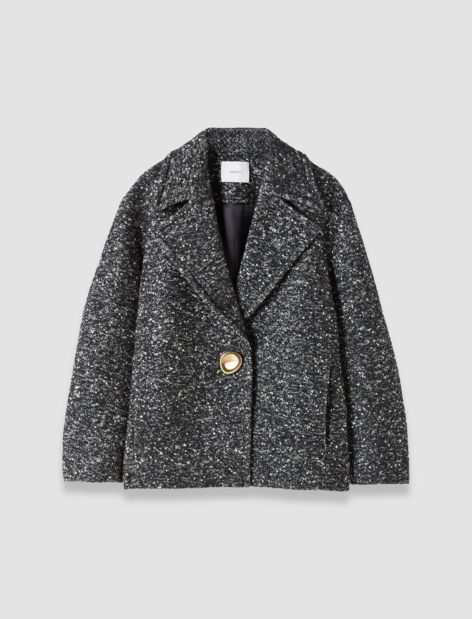 The Agar Donegal Tweed Wool Coat is a relaxed fit style, crafted from a warm, luxurious blend of soft virgin wool and mohair. Designed with a cocoon silhouette, it’s defined by its black and ivory speckled Donegal tweed texture, statement collar, and gold-tone bean button. Model wears size FR 38/UK 10/EU 36/US 6/DE 36/IT 42/JP 9 Details - Designed for a relaxed fit - Cocoon silhouette - Speckle tweed texture - Statement collar - Large bean button - Side pockets - Lined - Product code: jf0095060010 Care & Materials - 58% Virgin Wool 31% Alpaca 11% Polyamide - Do not wash - Do not bleach - Do not tumble dry - Iron low temperature setting - Dry clean