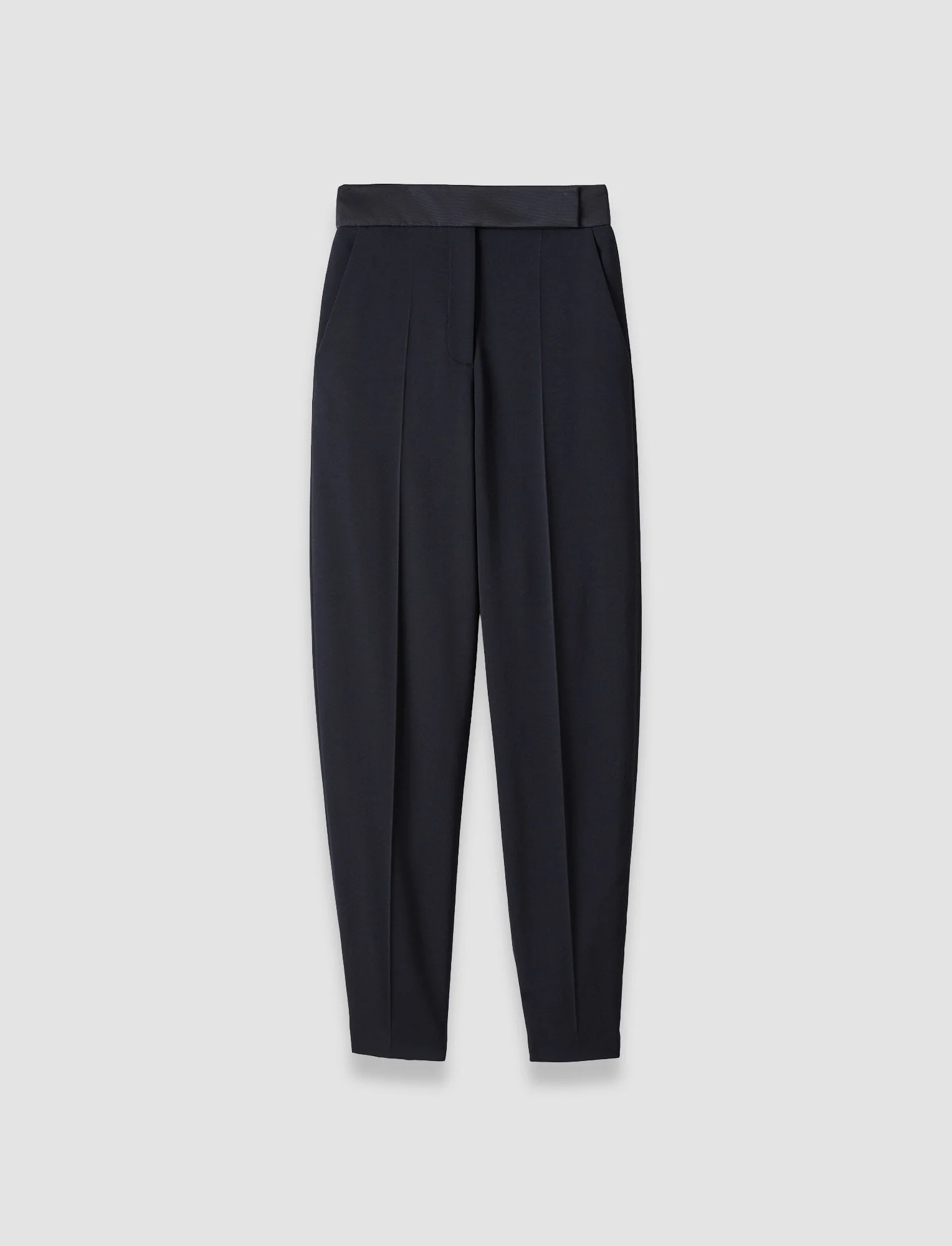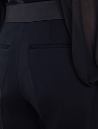 The Aix Tailored Crepe Trousers are an eveningwear trouser, crafted from a comfortable, stretchy viscose blend. A subtle nod to tuxedo dressing, these trousers are a barrel leg style, featuring a wide, satin faille waistband with an extended tab. Model wears size FR 38/UK 10/EU 36/US 6/DE 36/IT 42/JP 9 Details - Barrel leg - Mid-rise - Full-length - Wide, satin faille waistband - Side pockets - Extended waistband tab - Product code: jf0095050010 Care & Materials - 98% Viscose 2% Elastane - Do not wash - Do not bleach - Do not tumble dry - Iron low temperature setting - Dry clean