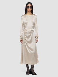 The Andrea Ruched Silk Satin Skirt is a fluid skirt, crafted from a luxurious, lustrous silk. The ruched detail to the side of the hip effortlessly creates a flattering silhouette. Striking in its simplicity, this skirt offers an elegant look. - 100% silk - Mid-length - Ruched side detail - Invisible side zip - Product code: jf0092331267 - Quail Beige SIZE ADVICE - Model wears size FR 36/UK 8/EU 34/US 4/DE 34/IT 40/JP 7 CARE & MATERIALS - 100% Silk - Machine wash, delicate program wash, very gentle spin - Do not bleach - Do not tumble dry - Iron low temperature setting - Dry clean - Use a mild detergent - Put in a laundry bag - Hang to dry - Wash inside out with similar colours - Iron inside out