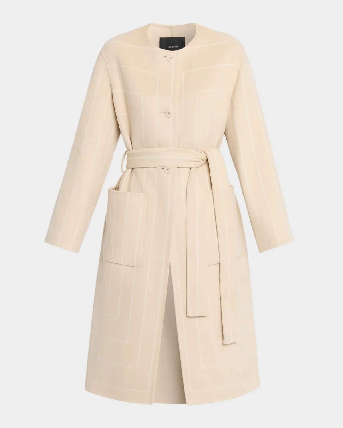 This Joseph coat is crafted in a doublefaced wool blend, detailed with a subtle geometric design and waist selftie to cinch the figure Crew neckline; button front Long sleeves Waist selftie Hip patch pockets Center front slit Hem falls below the knee Aline silhouette Wool/silk/polyester Dry clean Made in the USA