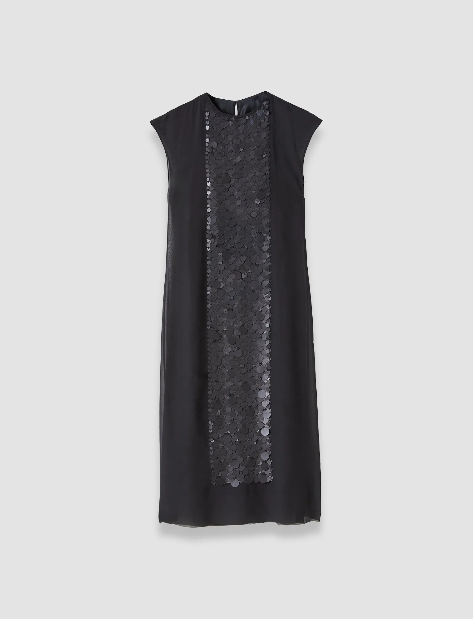The Boulle Chiffon Sequin Dress is a two-piece dress, both pieces can be worn separately. A sheer chiffon overlay embellished with matte sequins, layers over a tonal slip dress. Together they create a dimensional silhouette that moves fluidly. Cap sleeves and a relaxed, mid-length cut enhance the piece's effortless elegance. Model wears size FR 36/UK 8/EU 34/US 4/DE 34/IT 40/JP 7 Details - Two-piece design: sheer chiffon overlay and tonal slip dress - Wear each piece separately or together - Matte sequin paneling - Cap sleeves - Mid-length - Layers attach with small poppers - Product code: jf0095130010 Care & Materials - Chiffon overlay 100% Polyester - Slip dress 81% Acetate 19% Polyester - Do not wash - Do not bleach - Do not tumble dry - Iron low temperature setting - Dry clean - Put in a laundry bag