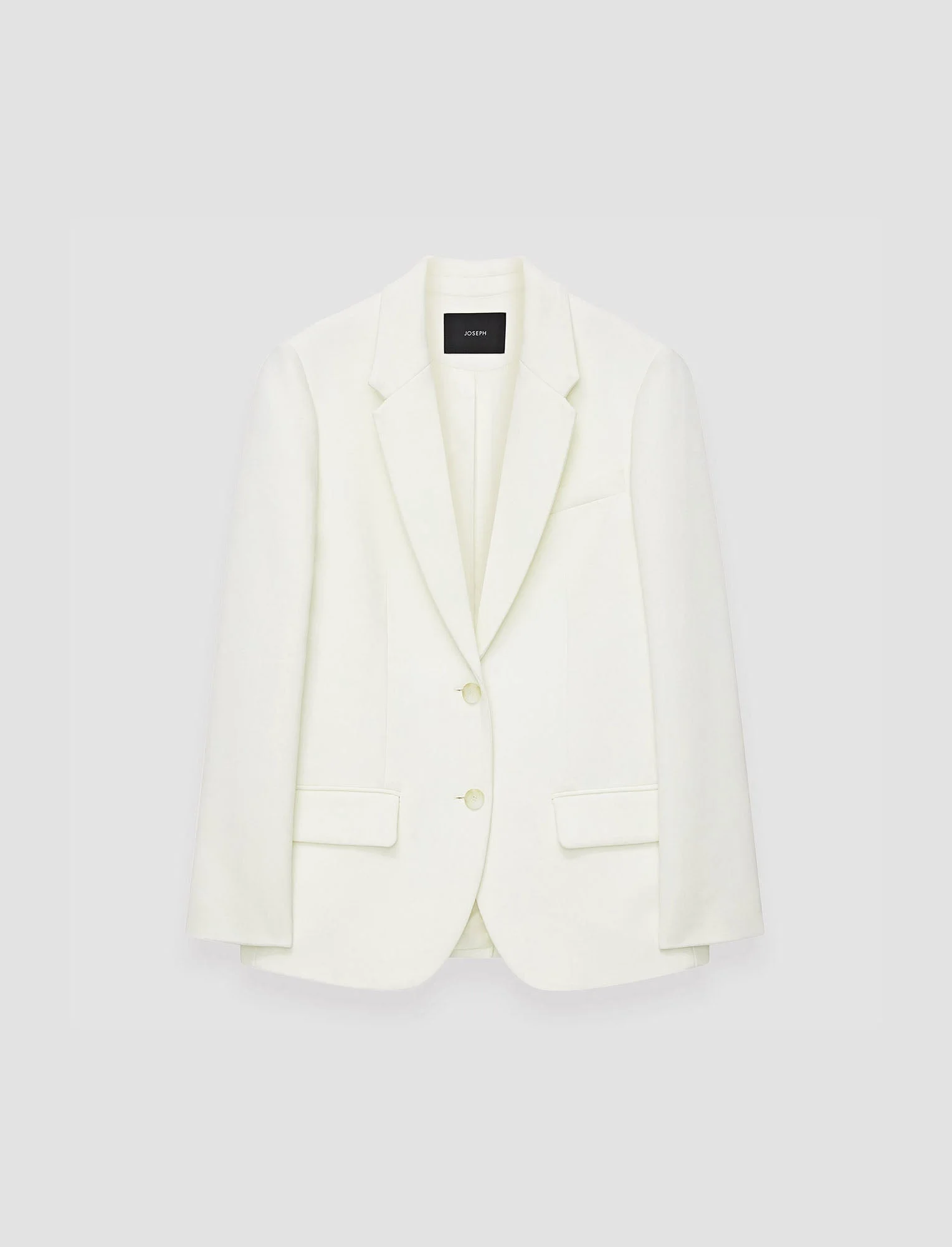 Part of the permanent Foundations Collection, the Comfort Cady Jackie Jacket is a regular fit, single breasted jacket, crafted from a viscose cady material which is compact and fluid. This JOSEPH signature style is lined with an inside chest pocket and finished with shoulder padding. - Designed for a regular fit - Single-breasted - Darts at the waist - Flap side pockets - Chest pocket outside and inside - We are recommending a size down - Product code: jp0013720045 SIZE ADVICE - We are recommending a size down - Model wears French size 36 CARE & MATERIALS - 77% Viscose 20% Acetate 3% Elastane - Do not wash - Do not bleach - Do not tumble dry - Iron low temperature setting - Dry clean mild