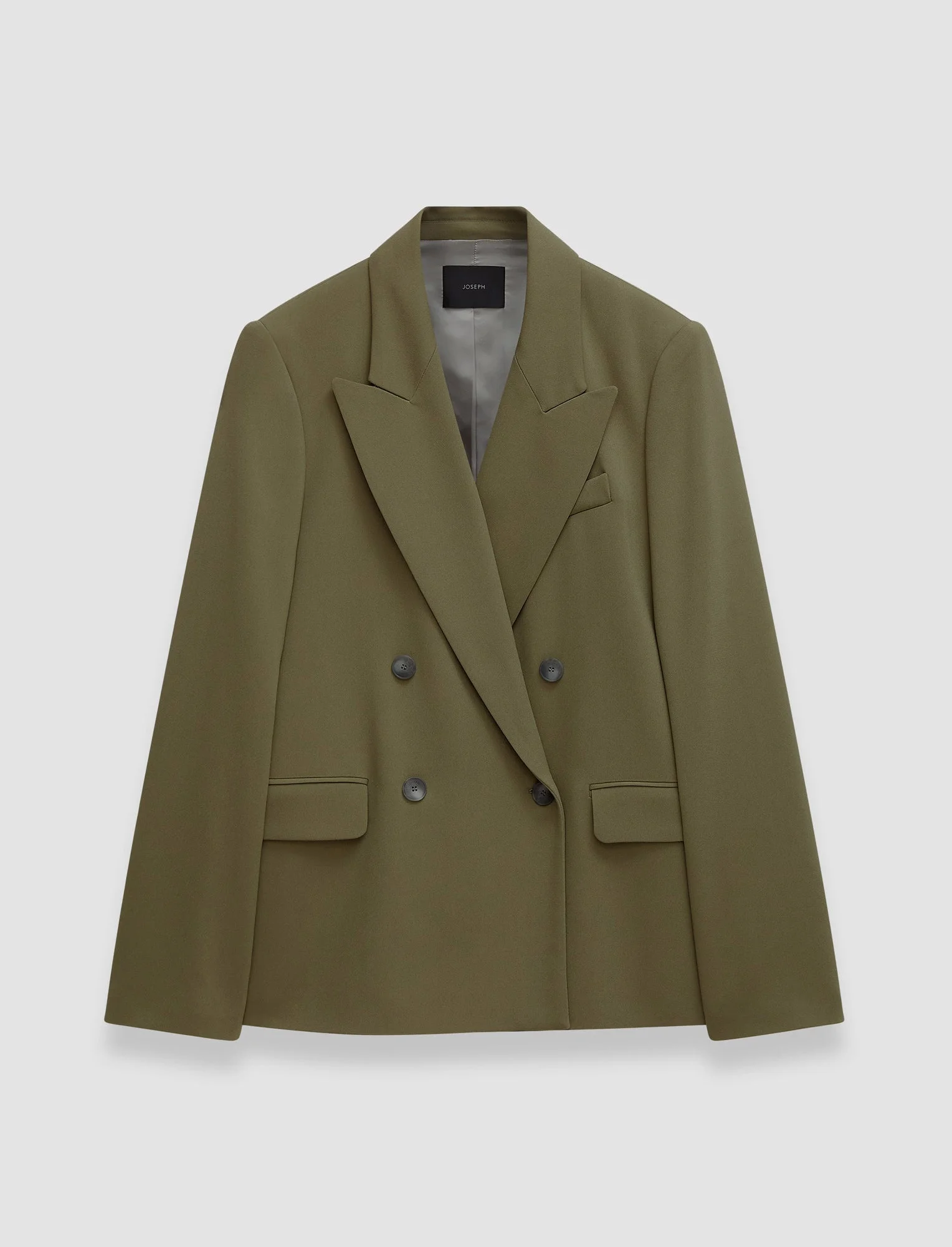 The Comfort Cady Jaden Jacket is a regular fit, double breasted blazer, crafted from a viscose cady material which is compact and fluid. This JOSEPH signature style is lined, featuring an inside chest pocket and soft shoulder padding. - Designed for a regular fit - Double-breasted - Side pockets - Chest pocket outside and inside - Four-button cuffs - Product code: jp0015521325 SIZE ADVICE - Model wears French size 36 CARE & MATERIALS - 77% Viscose 20% Acetate 3% Elastane - Do not wash - Do not bleach - Do not tumble dry - Iron low temperature setting with a piece of fabric between - Dry clean very light with restriction