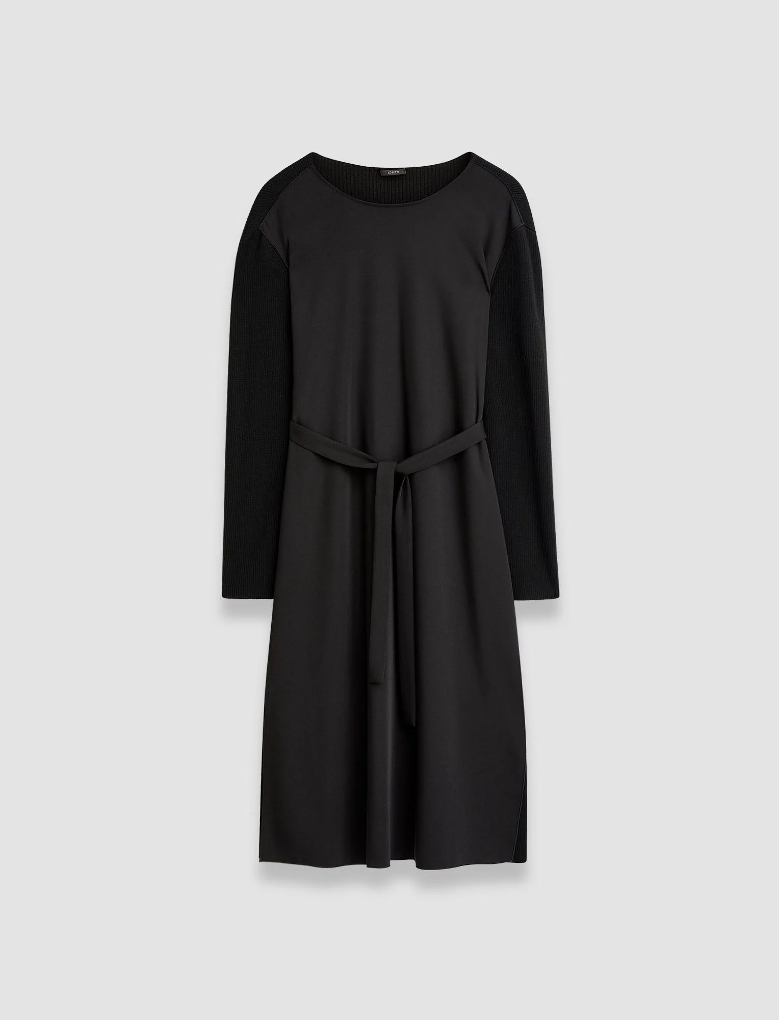 The Drapy Cady Didot Dress is a loose, straight fit dress. This bi-material dress offers comfort and versatility. It features a fluid, silk-like front, with the back and sleeves finished in a ribbed knit. Model wears size FR 38/UK 10/EU 36/US 6/DE 36/IT 42/JP 9 Details - Designed for a straight fit - Mid-length - Knitted back and sleeves - Removeable belt - Side slits - Product code: jf0087140010 Care & Materials - Front 100% Polyester - Knitwear 100% Wool - Do not wash - Do not bleach - Do not tumble dry - Iron low temperature setting - Dry clean