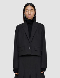 The Elia Flannel Wool Jacket is a boxy fit, cropped jacket, crafted from virgin wool. This tailored jacket features a back pleat and shoulder padding creating a modern, clean-cut silhouette. Offering structure and comfort, it has a woollen texture and a low button closure. Model wears size FR 40/UK 12/EU 38/US 8/DE 38/IT 44/JP 11 Details - Designed for a boxy fit - Single-breasted - Welt flap pockets - Shoulder padding - Back pleat with tab - Inside pocket - Lined - Product code: jf0094650261 Care & Materials - 98% Virgin Wool 1% Elastane 1% Polyamide - Do not wash - Do not bleach - Do not tumble dry - Iron low temperature setting - Dry clean