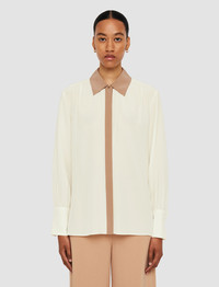The Evora Silk Crepe de Chine Colourblock Blouse is a regular fit blouse, crafted from a lightweight silk crepe which has a smooth, crisp hand feel. This piece is elevated through its contrasting coloured collar and placket. It features gathered detailing at the shoulders, back and cuffs. - 100 % silk - Designed for a regular fit - Step hem - Product code: jf0089951914 - Ivory/Blusher SIZE ADVICE - Model wears size FR 36/UK 8/EU 34/US 4/DE 34/IT 40/JP 7 CARE & MATERIALS Discover the Care Guide, a guide to help you to care for your garments. - 100% Silk - Do not wash - Do not bleach - Do not tumble dry - Iron low temperature setting - Dry clean