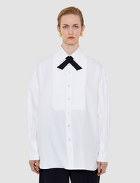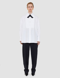 The Ferrus Tuxedo Cotton Shirt offers an oversized silhouette, expertly crafted from 100% cotton in an Oxford weave. Blending masculine feminine dress codes, it features a classic pintuck bib front and a grosgrain wrap bow-tie. Blouson sleeves, soft back pleats, and a curved hemline introduce subtle volume and fluid proportion, bringing elegance to this modern interpretation of a tuxedo shirt. Model wears size FR 40/UK 12/EU 38/US 8/DE 38/IT 44/JP 11 Details - Designed for an oversized fit - Pintuck bib front - Removable grosgrain wrap bow-tie - Blouson sleeves - Double back pleat - Curved hemline - Product code: jf0095190020 Care & Materials - 100% Cotton - Machine wash, delicate program wash, 30 °C max, gentle spin - Do not bleach - Do not tumble dry - Iron medium temperature setting - Dry clean - Use a mild detergent - Hang to dry - Wash inside out with similar colours