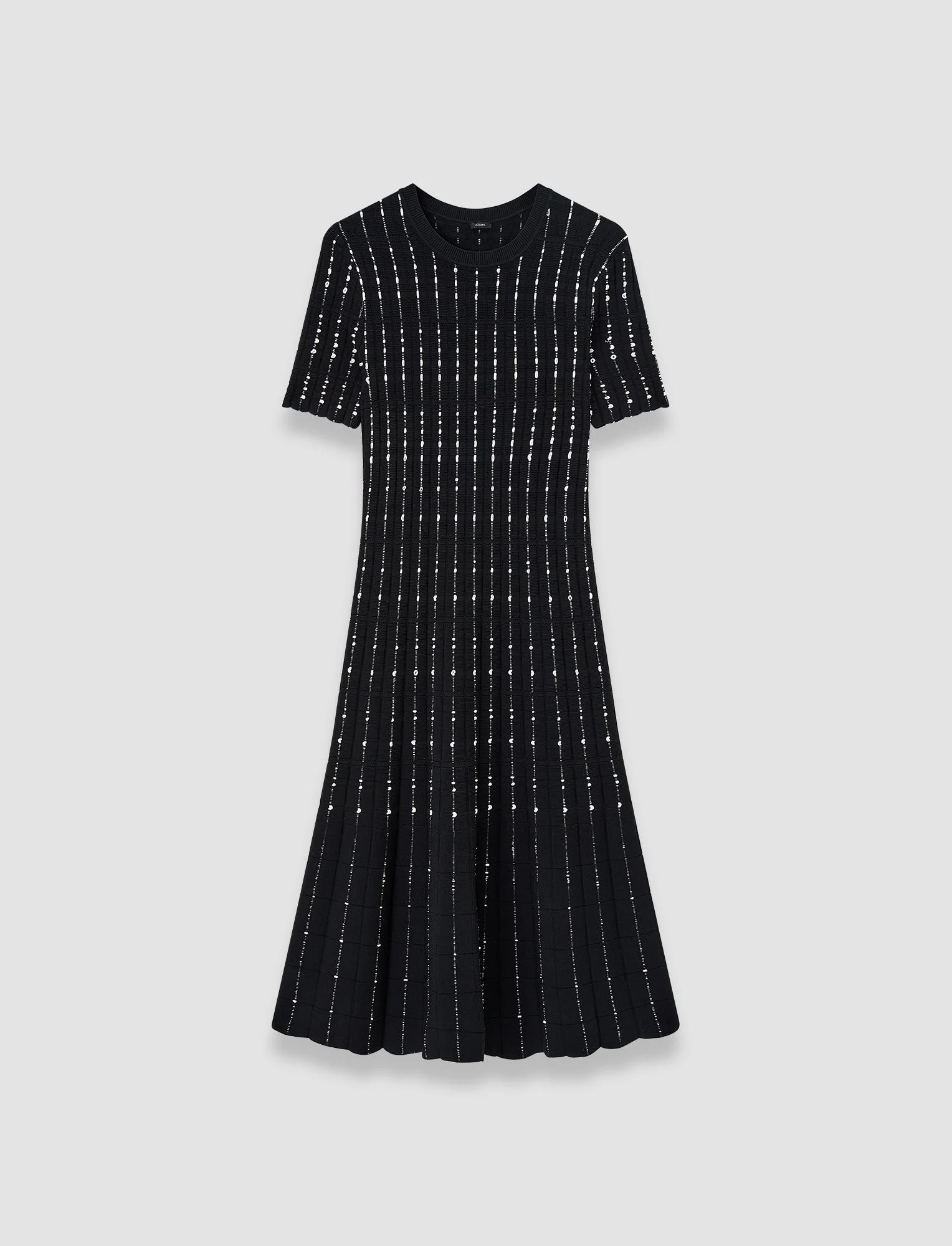 The Fragmented Stripes Dress is a fit to flare dress, crafted from a viscose blend. This elegant piece features a contrasting dotted, stripe pattern. Its compact, ribbed knit design provides a flattering weight and drape. Model wears size M Details - Fit to flare - Mid-length - Round neck - Short sleeves - Compact and stretchy - Product code: jf0093221906 Care & Materials - 77% Viscose 16% Elastane 5% Cotton 2% Polyester - Machine wash, hand wash cycle, wool/silk program, very gentle spin - Do not bleach - Do not tumble dry - Iron low temperature setting - Dry clean - Use a wool shampoo - Put in a laundry bag - Wash inside out with similar colours - Dry flat - Iron inside out