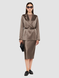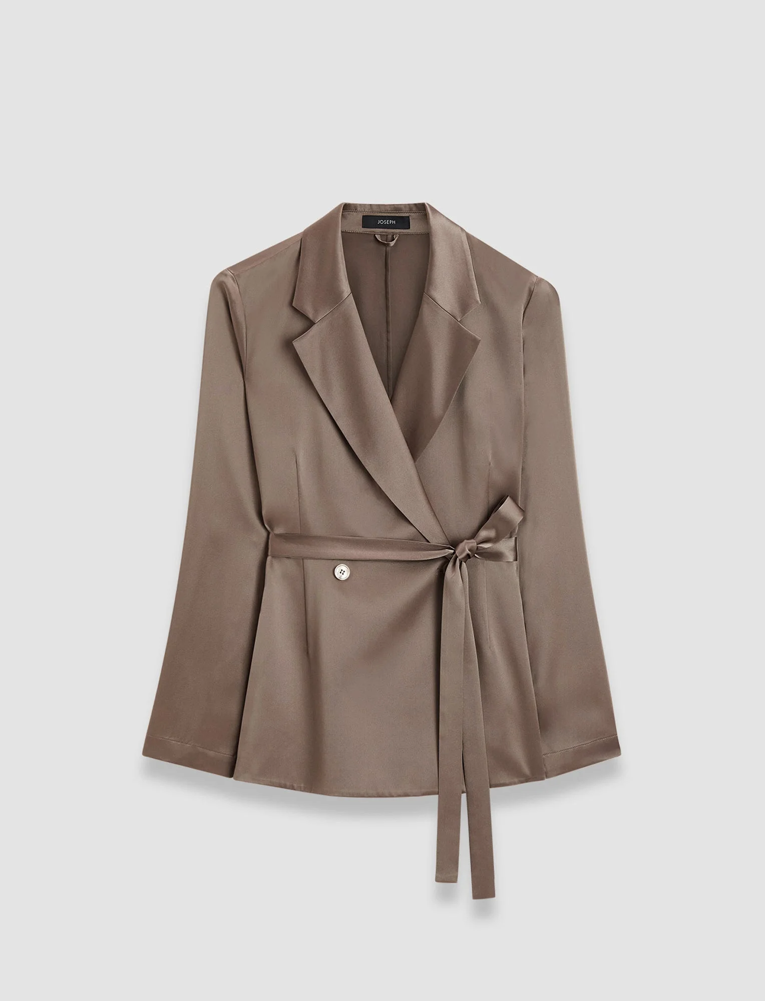 The Joubert Silk Satin Jacket is a regular fit, double-breasted jacket. Crafted from a luxurious, lustrous silk which is ultra smooth and rich in colour. This elegant jacket is lightweight; it can be worn on its own or as a layering piece. - 100% silk - Designed for a regular fit - Double-breasted - Two button closure - Removeable belt - Lightweight - Product code: jf0088851251 - Escargot Grey SIZE ADVICE - Model wears size FR 36/UK 8/EU 34/US 4/DE 34/IT 40/JP 7 CARE & MATERIALS Discover the Care Guide, a guide to help you to care for your garments. - 100% Silk - Do not wash - Do not bleach - Do not tumble dry - Iron low temperature setting - Dry clean