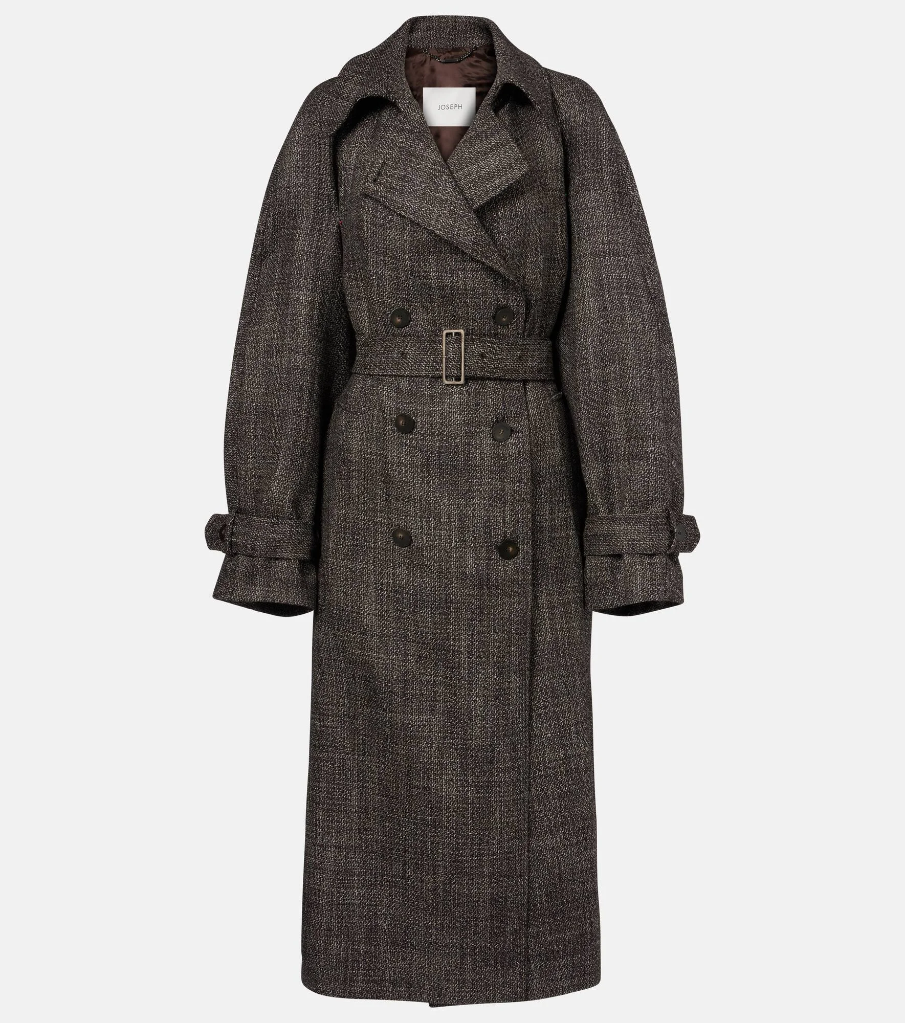 Notable for its understated yet sophisticated approach to design, Joseph delivers the building blocks for your forever wardrobe. The Laurin double-breasted coat is crafted from textured virgin wool and showcases a slim, fluid silhouette, complete with a matching detachable belt. Product Details - Material: 100% virgin wool - Care instructions: dry clean - Made in Portugal - Color: brown - Designer color name: Cocoa - Item color: brown - Hardware color: silver - Closure: double-breasted (six buttons) - Cuff: strap, buckle and loops - Pockets: welt pockets - Belt loops - Detachable belt - Vent: single - Quarter-lined - Item number: P01119538 Size & Fit - True to size - Loose fit, comes with belt - Non-stretchy fabric - slit length 62cm-24.5" - The model seen in the picture is 178cm-5'10" and wearing a size FR 36
