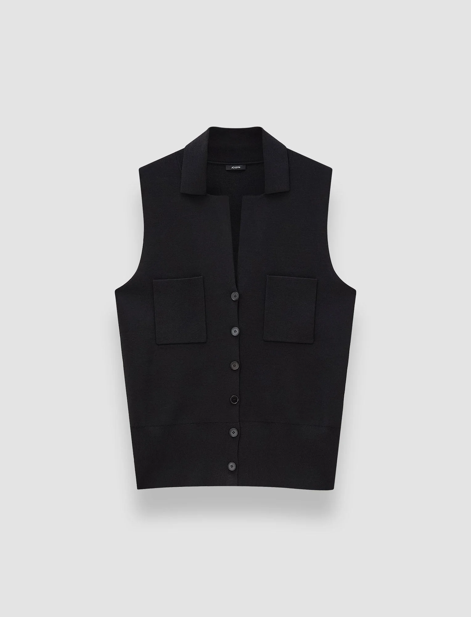 The Milano Knit Stretch Vest is a regular fit vest, crafted from a stretchy viscose blend. Knitted together in a compact Milano stitch delivering a polished, clean look and comfort. It's finished with patch pockets and a ribbed hemline. Model wears size S Details - Designed for a regular fit - Collar and lapels - Patch pockets - Product code: jf0094700010 Care & Materials - 73% Viscose 24% Polyamide 3% Elastane - Do not wash - Do not tumble dry - Iron low temperature setting - Do not bleach - Dry clean