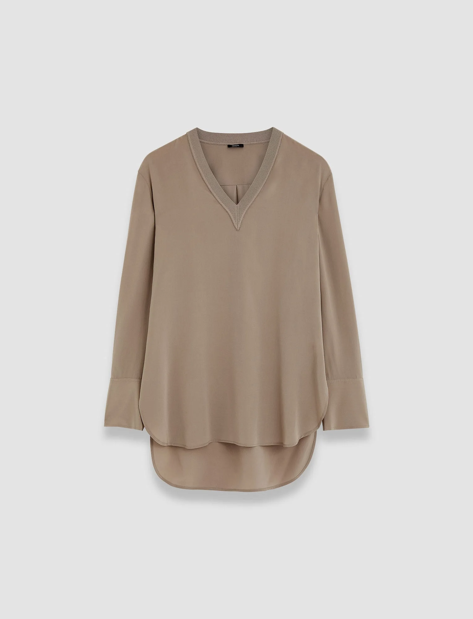 The Miller Crepe de Soie Silk Blouse is a relaxed fit, V neck blouse, crafted from a lightweight silk crepe. This effortless blouse is finished with a tonal, ribbed neckline. It has a curved step hemline for an easy-wearing silhouette, offering the option to easily tuck-in. - 100% silk - Designed for a relaxed fit - V neck - Tonal ribbed neckline - Wide cuffs - Curved, step hemline - Product code: jf0090711251 - Escargot Grey SIZE ADVICE - Model wears size FR 40/UK 12/EU 38/US 8/DE 38/IT 44/JP 11 CARE & MATERIALS Discover the Care Guide, a guide to help you to care for your garments. - 100% Silk - Machine wash, wool/silk program wash, very gentle spin - Do not bleach - Do not tumble dry - Iron low temperature setting - Dry clean - Use a special wool/silk detergent - Wash inside out with similar colours - Put in a laundry bag - Iron inside out - Hang to dry