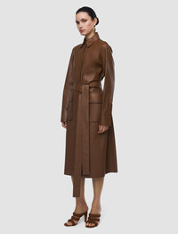 The Okabe Soft Nappa Leather Coat is a regular fit coat, crafted from supple nappa leather for exceptional softness and comfort. It features a sharp shirt-style collar and cuffs, blending classic tailoring with a modern edge. The patch pockets and belted waist further define the silhouette, enhancing its sleek, elongated shape. Its perfect for elevating both day and evening outfits. Model wears size FR 38/UK 10/EU 36/US 6/DE 36/IT 42/JP 9 Details - Designed for a regular fit - Mid-length - Button fasten with concealed placket - Shirt collar and cuffs - Patch pockets - Tie belt - Back vent - Unlined - Product code: jf0095860605 Care & Materials - 100% Lamb skin - Do not wash - Do not bleach - Do not iron - Do not tumble - Do not dry clean - Cleaning by a leather specialist only