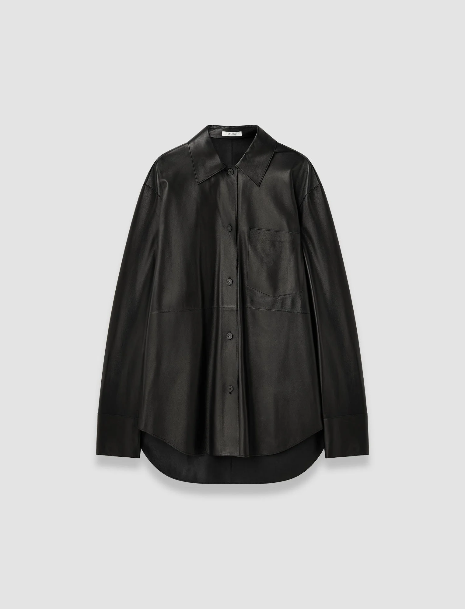The Penna Soft Nappa Leather Overshirt is an oversized style, crafted from supple nappa leather for exceptional comfort and softness. It features a sharp shirt-style collar and cuffs with a curved hemline, blending classic tailoring with a modern edge. It's easy-wearing silhouette makes it a versatile layering piece. Model wears size FR 38/UK 10/EU 36/US 6/DE 36/IT 42/JP 9 Details - Designed for an oversized fit - Shirt collar and cuffs - Snap buttons - Chest pocket - Curved hemline - Unlined - Product code: jf0095840010 Care & Materials - 100% Lamb skin - Do not wash - Do not bleach - Do not iron - Do not tumble - Do not dry clean - Cleaning by a leather specialist only
