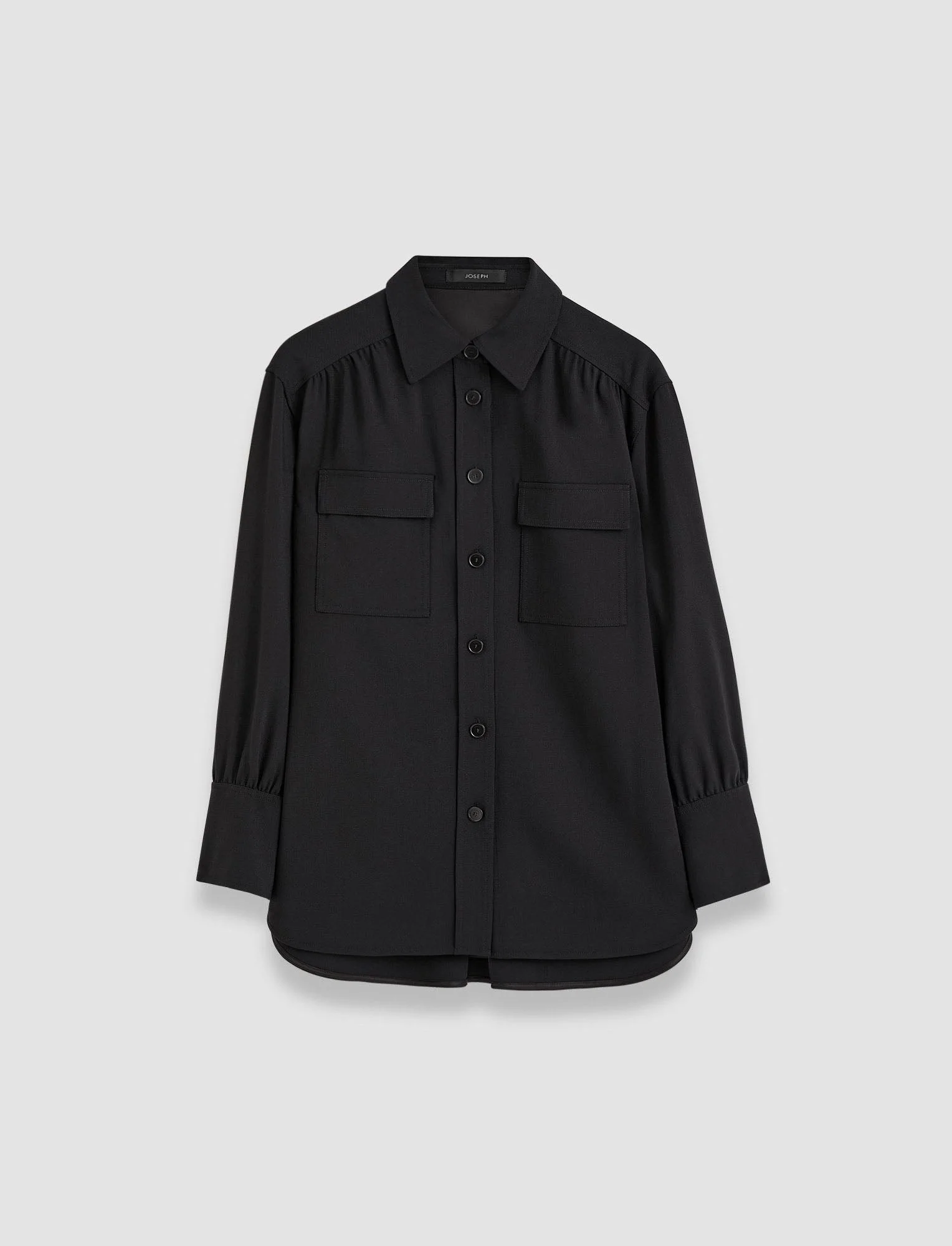 The Perle Fluid Twill Wool Shirt is a relaxed fit overshirt, crafted from a luxurious blend of viscose and merino wool. This fluid style features utility inspired detailing, from the buttons, front flap pockets and shoulder yokes with gathering. - Designed for a relaxed fit - Front flap pockets - Gathered detailing - Product code: jp0017030010 - Black SIZE ADVICE - Model wears size FR 40/UK 12/EU 38/US 8/DE 38/IT 44/JP 11 CARE & MATERIALS Discover the Care Guide, a guide to help you to care for your garments. - 60% Viscose 40% Virgin wool - Do not wash - Do not bleach - Do not tumble dry - Iron low temperature setting - Dry clean