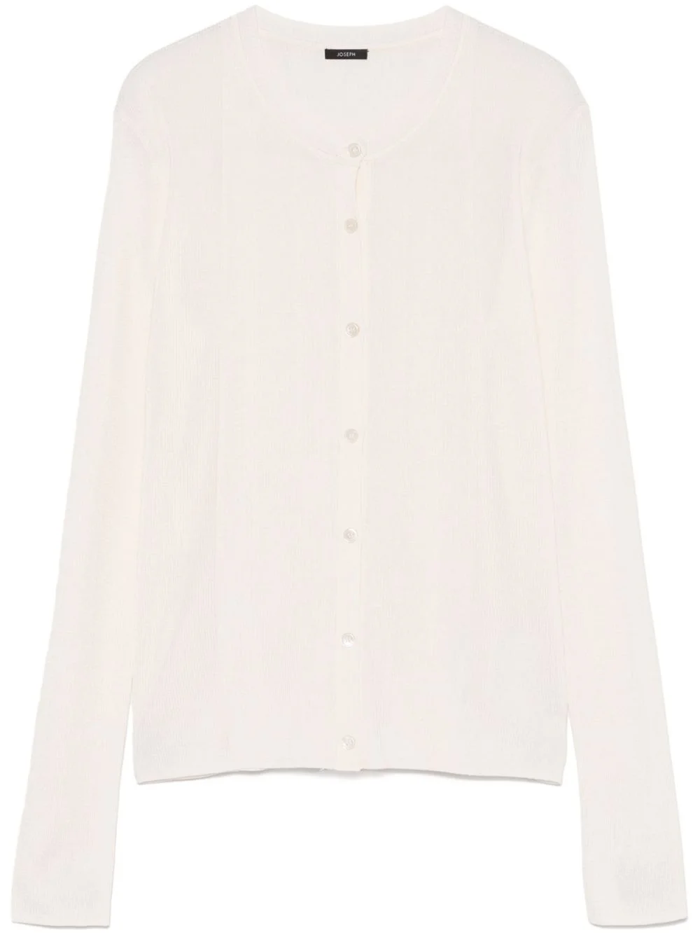 ribbed-knit cardigan Highlights - Light beige - Front button fastening - Crew neck - Long sleeves - Straight hem Imported Composition Viscose 63%, Paper 37% Washing instructions Dry Clean Only