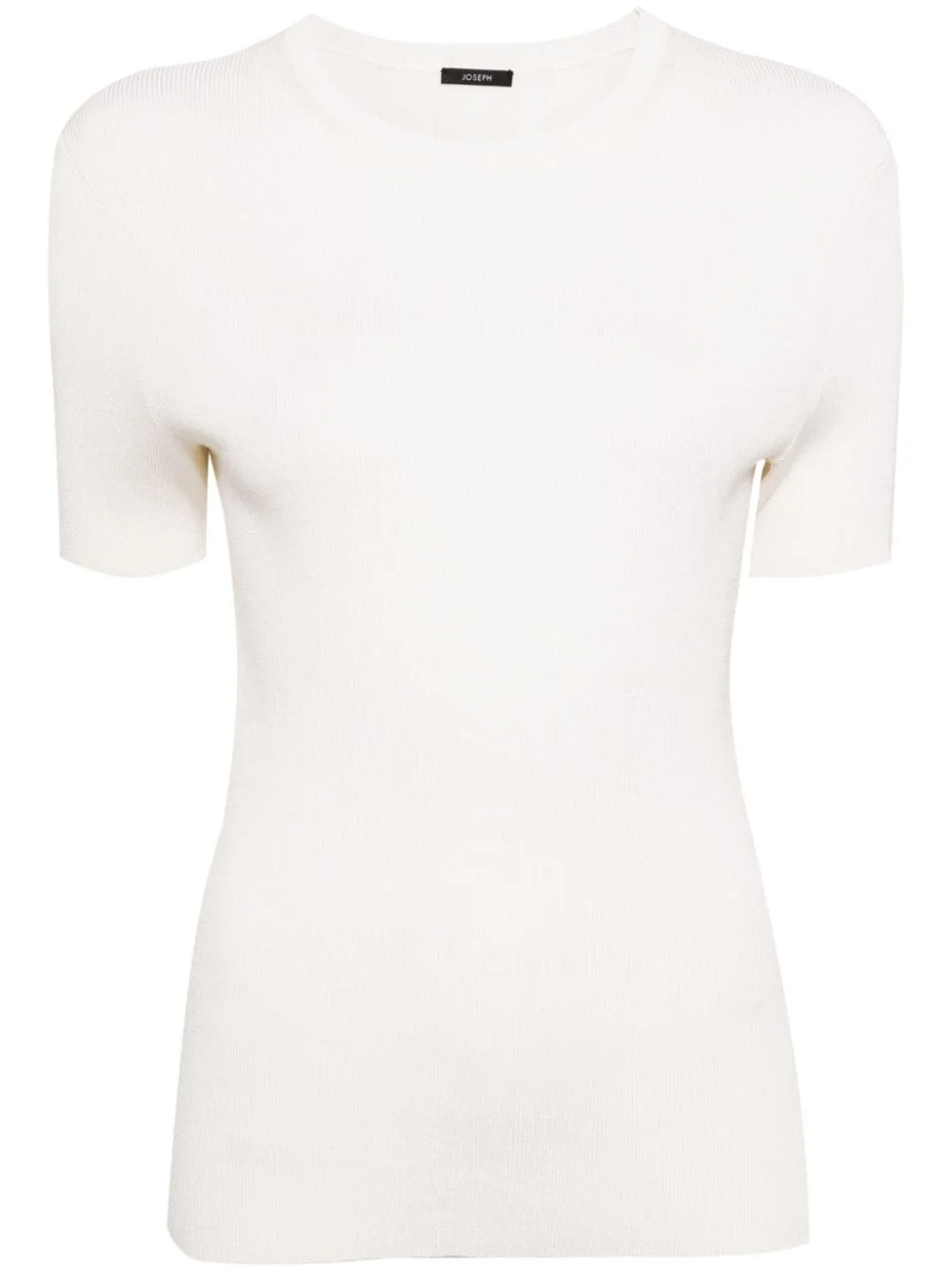 round-neck knitted top Highlights - Ivory white - Knitted construction - Mixed knit - Crew neck - Short sleeves - Straight hem Imported Composition Viscose 92%, Polyester 6%, Polyamide 2%