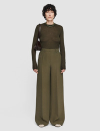 The Silk Crepe Alana Trousers are a high-rise, wide leg trousers, crafted from a blend of silk and viscose. These trousers offer a flattering fit around the waist and hips into a fluid wide leg. The central pressed creases create an elegant, tailored look. - Designed for a regular fit - Wide leg - High-rise - Side pockets - Full-length - Delicate fabric, handle with care - Product code: jf0087191203 SIZE ADVICE - Regular outer leg length 113cm - 116cm - Shorter outer leg length 102cm - 105cm - Model wears French size 36 Discover the Trouser Guide and find your perfect fit CARE & MATERIALS Discover the Care Guide, a guide to help you to care for your garments. - 66% Silk 34% Viscose - Do not wash - Do not bleach - Do not tumble dry - Iron low temperature setting - Dry clean very light with restriction