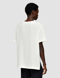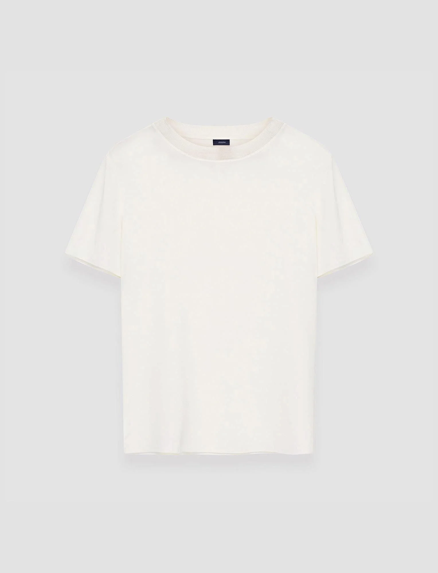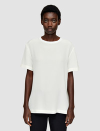 Part of the permanent Foundations Collection, the Silk Crepe de Soie Rubin Blouse is a regular fit, straight cut top, crafted from a lightweight silk crepe. This essential style is an elevated take on the everyday t-shirt; minimal and crisp finished with a tonal ribbed neckline. - 100% silk - Designed for a regular fit - Straight cut - Tonal ribbed neckline - Product code: jf0084030045 SIZE ADVICE - Model wears French size 36 CARE & MATERIALS Discover the Care Guide, a guide to help you to care for your garments. - 100% Silk - Machine wash, wool/silk program wash, very gentle spin - Do not bleach - Do not tumble dry - Iron low temperature setting - Dry clean very light with restriction - Use a special wool/silk detergent - Wash inside out with similar colours - Put in a laundry bag - Iron inside out - Hang to dry