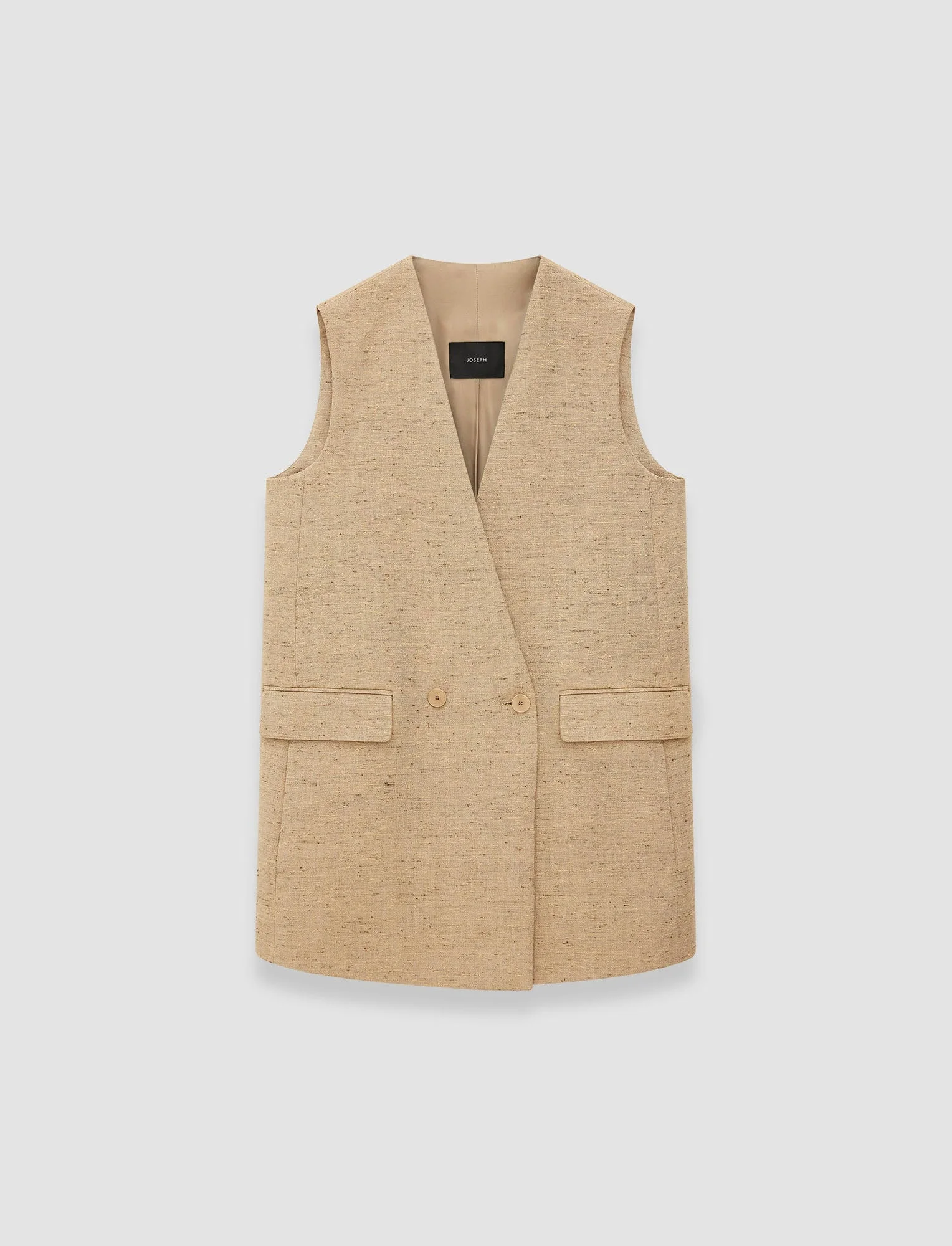 The Speckled Linen Arago Waistcoat is a relaxed fit, double-breasted waistcoat, crafted from a blend of viscose, silk and linen. This piece is a longline style falling below the hips. It's structured, offering a masculine inspired, tailored look. - Designed for a relaxed fit - Double-breasted - Longline - Front flap and side pockets - Low V neckline - Product code: jp0016181232 SIZE ADVICE - Length 77cm - 83cm - Model wears French size 38 CARE & MATERIALS Discover the Care Guide, a guide to help you to care for your garments. - 79% Viscose, 14% Silk, 7% Linen - Do not wash - Do not bleach - Do not tumble dry - Iron low temperature setting - Dry clean mild